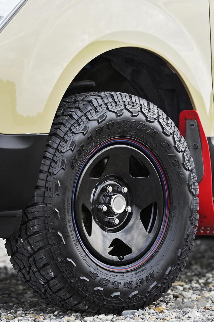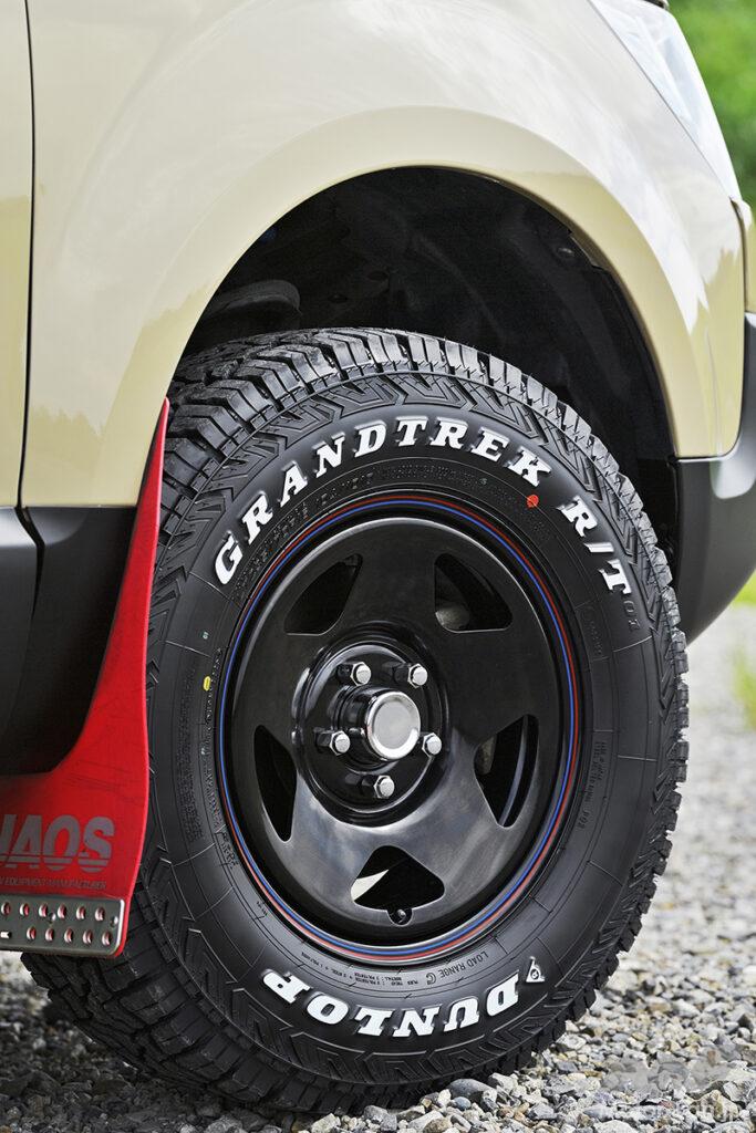 そんな車体を支える足まわりにはオリジナルのアップサスを装着。また、ホイールはこれまたロードランナーのオリジナルパーツとなる„デイトナsotec"の16インチ7.0J+35を履いた。そして何よりもデリカD:5のスタイルを際立たせているのがダンロップの最新タイヤ『グラントレックR/T01』。A/Tタイヤの快適性とM/Tタイヤのカッコ良さを兼ね備えたラギットテレーンタイヤ。M/Tらしいゴツゴツとしたデザインが際立ち、それでありながら静粛性に優れ、乗り心地も抜群とまさに「最強の一角」とでもいうべきタイヤなのだ。見た目にも乗り心地にもこだわるなら、ぜひ心に留めておいて欲しい。