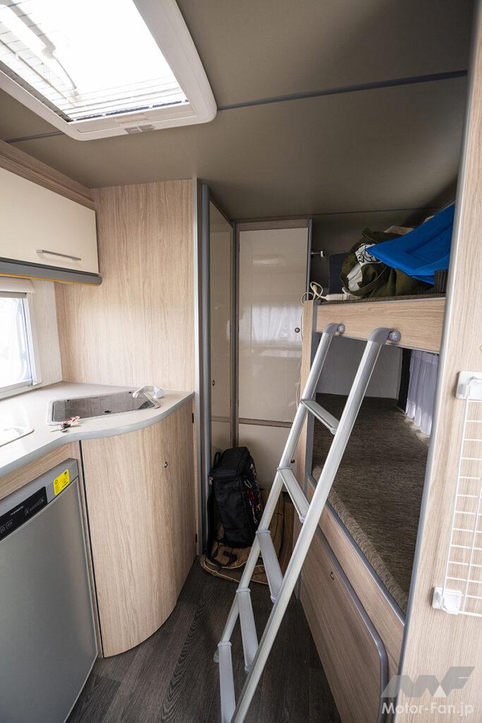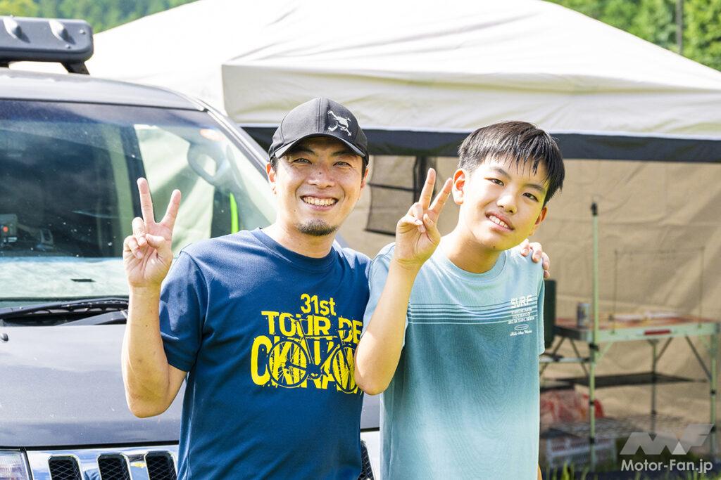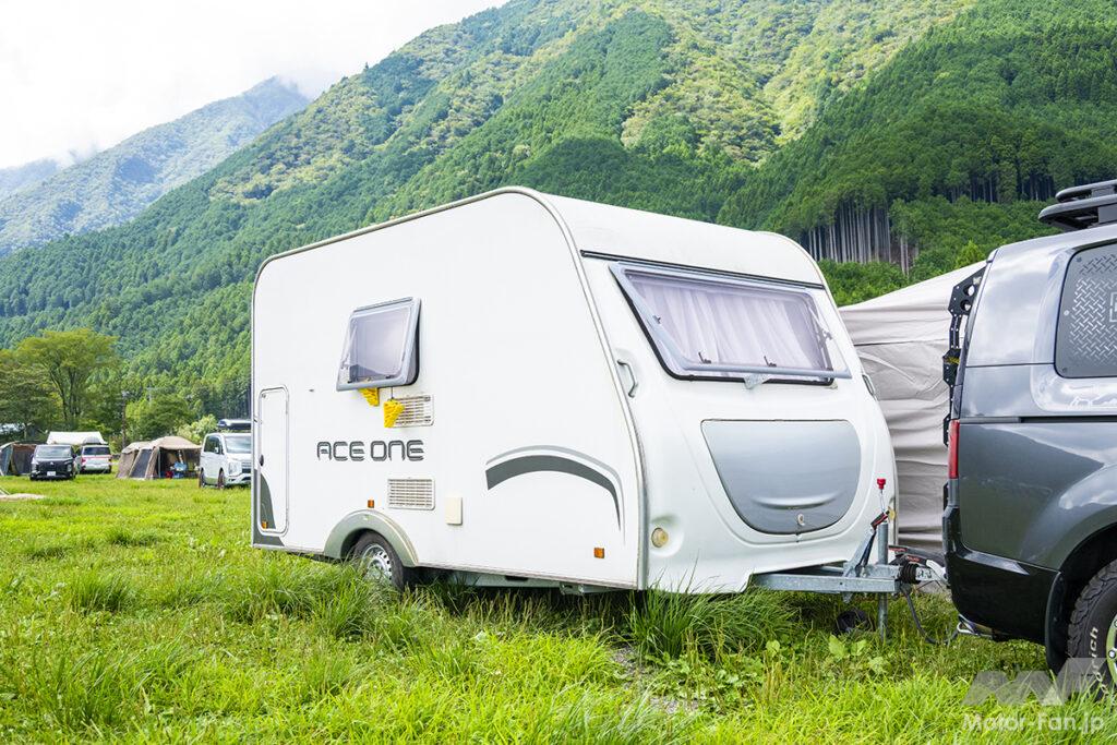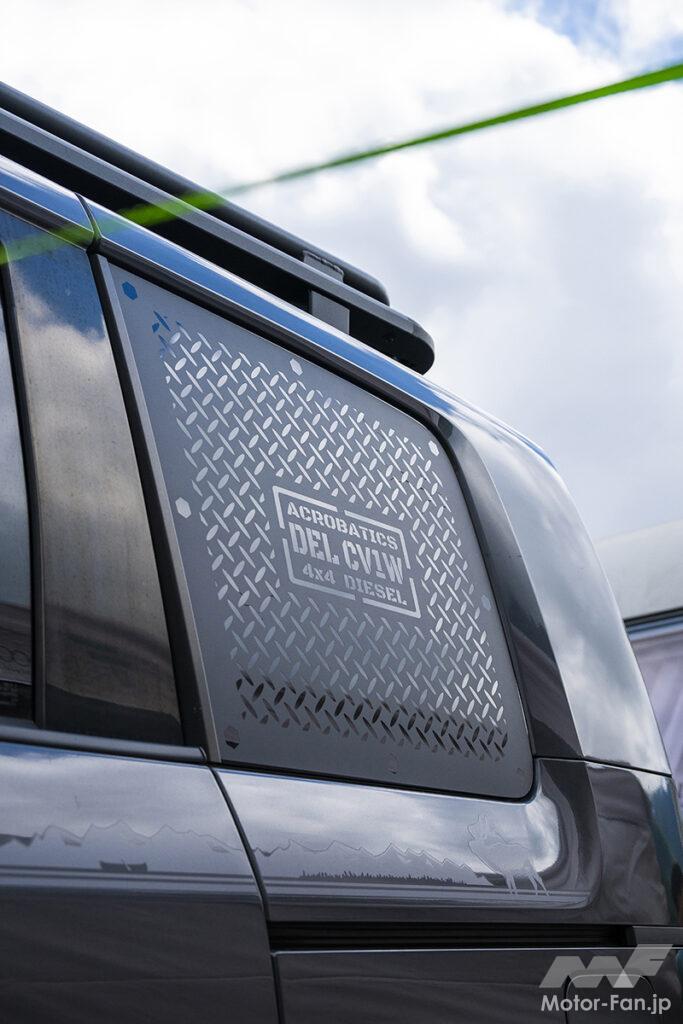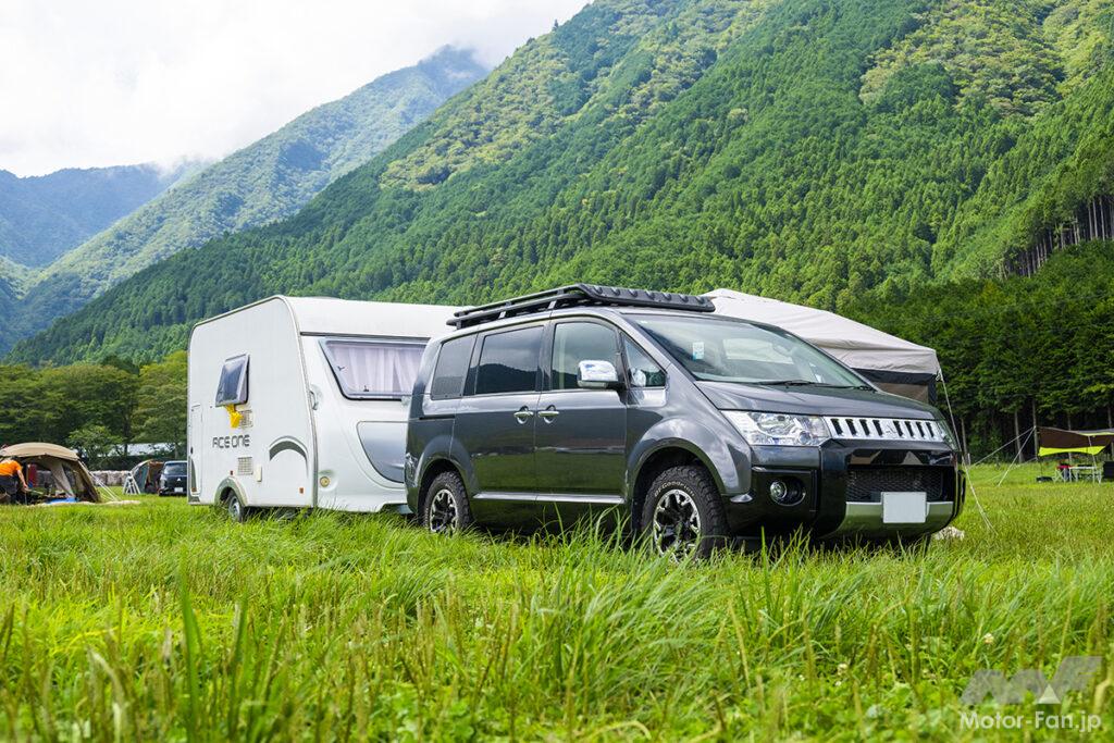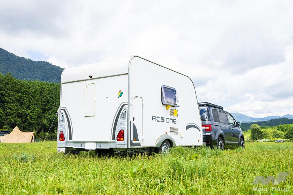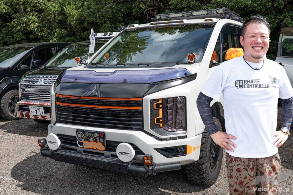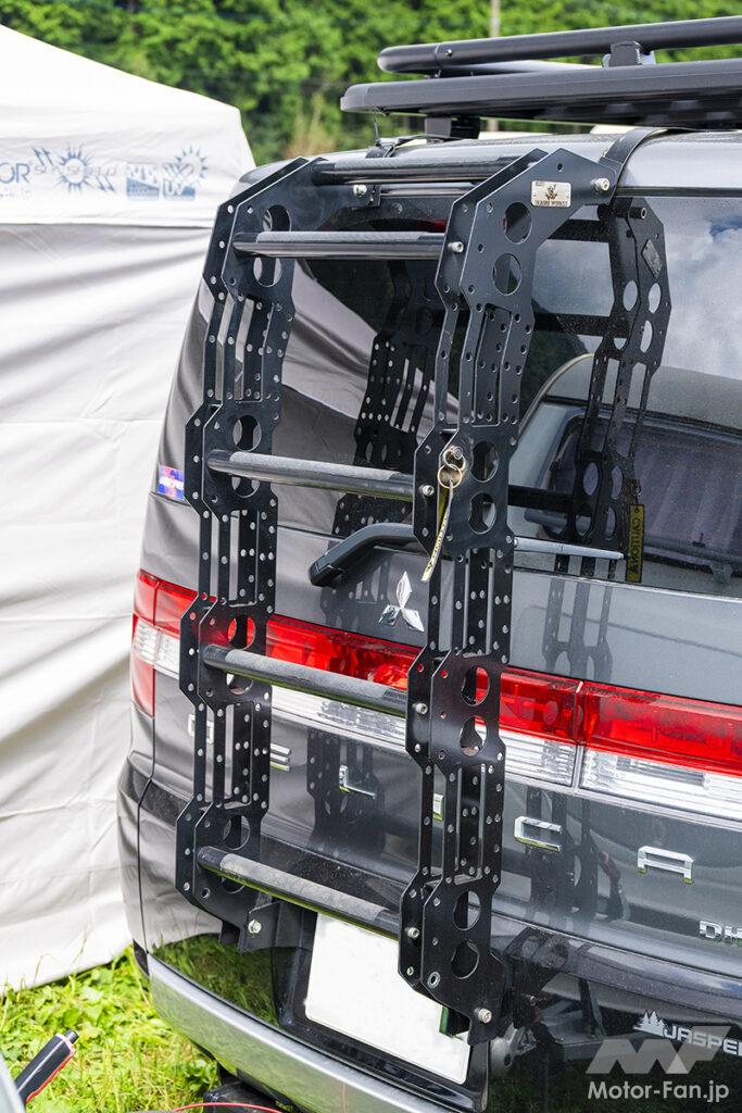 6年前、載っていたアウトランダーからD:5へと乗り換えようと考えていたオーナー。「新型の顔が気に入らなくて、2018年モデルを探して新古車で手に入れました」というこだわりの1台。「マウンテンバイクをやっているので、結構道の悪い所に入って行くので、ホイールはあえて16インチにしました」というMGゴーレムをセットする。お気に入りはカエルワークス製のリアラダー。シリアルナンバー入りの貴重な逸品。後ろで引っ張るトレーラーは「不動産屋の兄がコロナ禍の商談スペースとして購入したもので、今は自分の家の庭に置いてあり、普段は自分の仕事や昼寝用スペースになっています」というエースワン330。「お手頃だし、牽引免許がいらないのでオススメですね」。