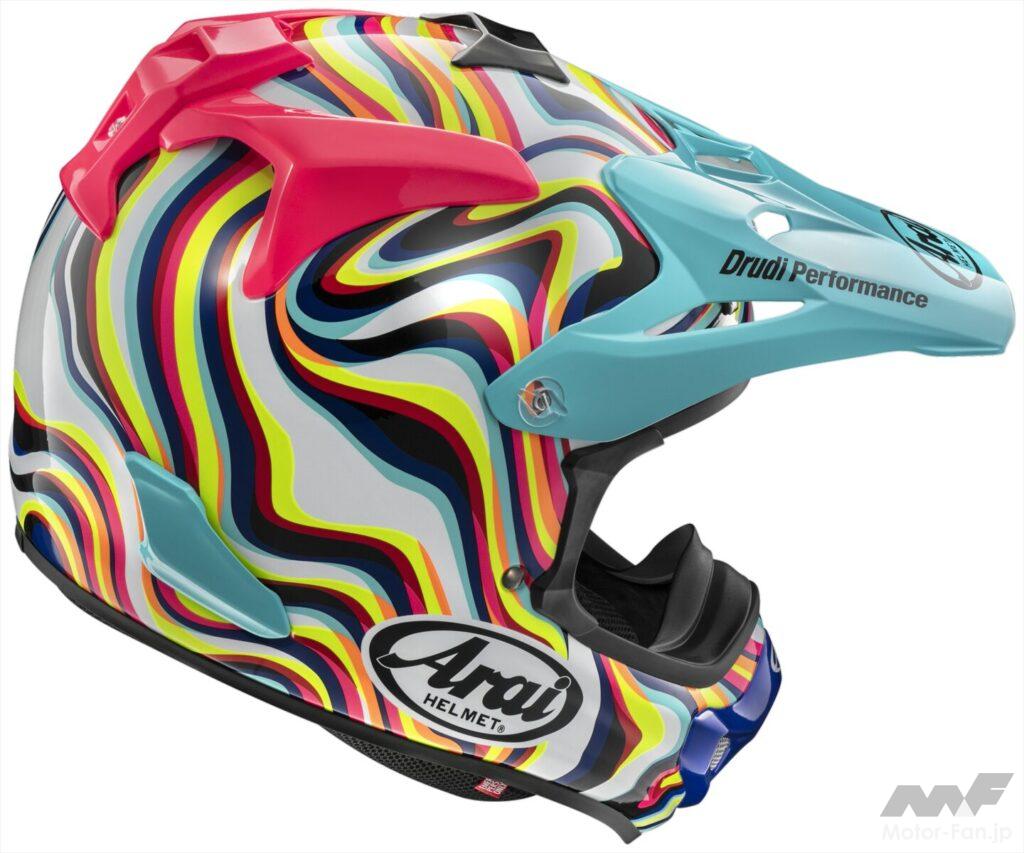 今回追加されたカラー「STREAM(ストリーム)」は、オフロードライディングの派手で激しいイメージを力強く表現。オフロードコースのクネクネとしたタイトな連続コーナーをスムーズな流れに沿って走り抜けるさまを、華麗に、カラフルに表現しているカラーは、激しく戦うオフロードバトルシーンで映えるピンク、ブルーの2色展開。レーサーはもちろん、最新モタードモデルなどに合わせてもアグレッシブで面白そうだ。