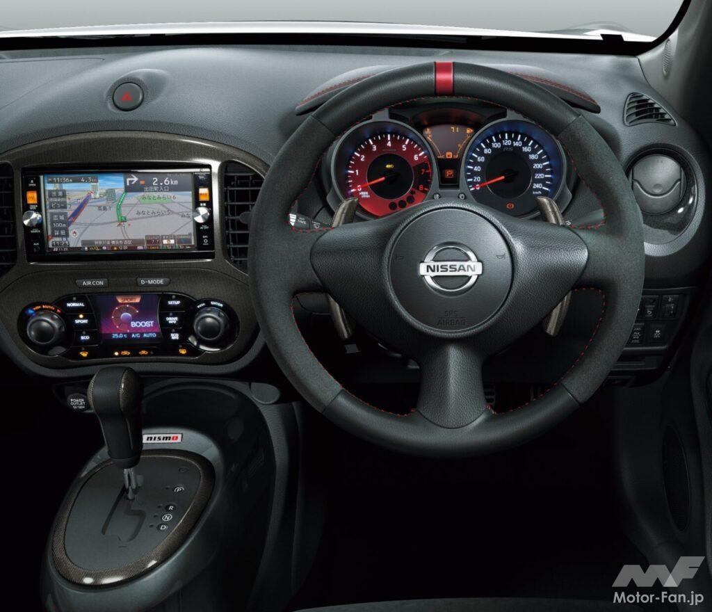 ジュークNISMOは、エアロダイナミクスを追求したフロントバンパー、サイドシルプロテクター、ルーフスポイラーなどの専用エクステリアを採用し、インテリアについてもクルマとの一体感を高めるコクピット周りが演出された。