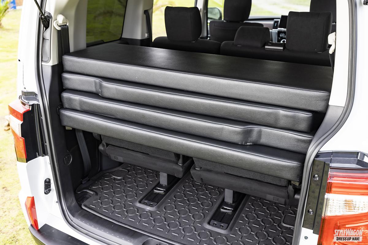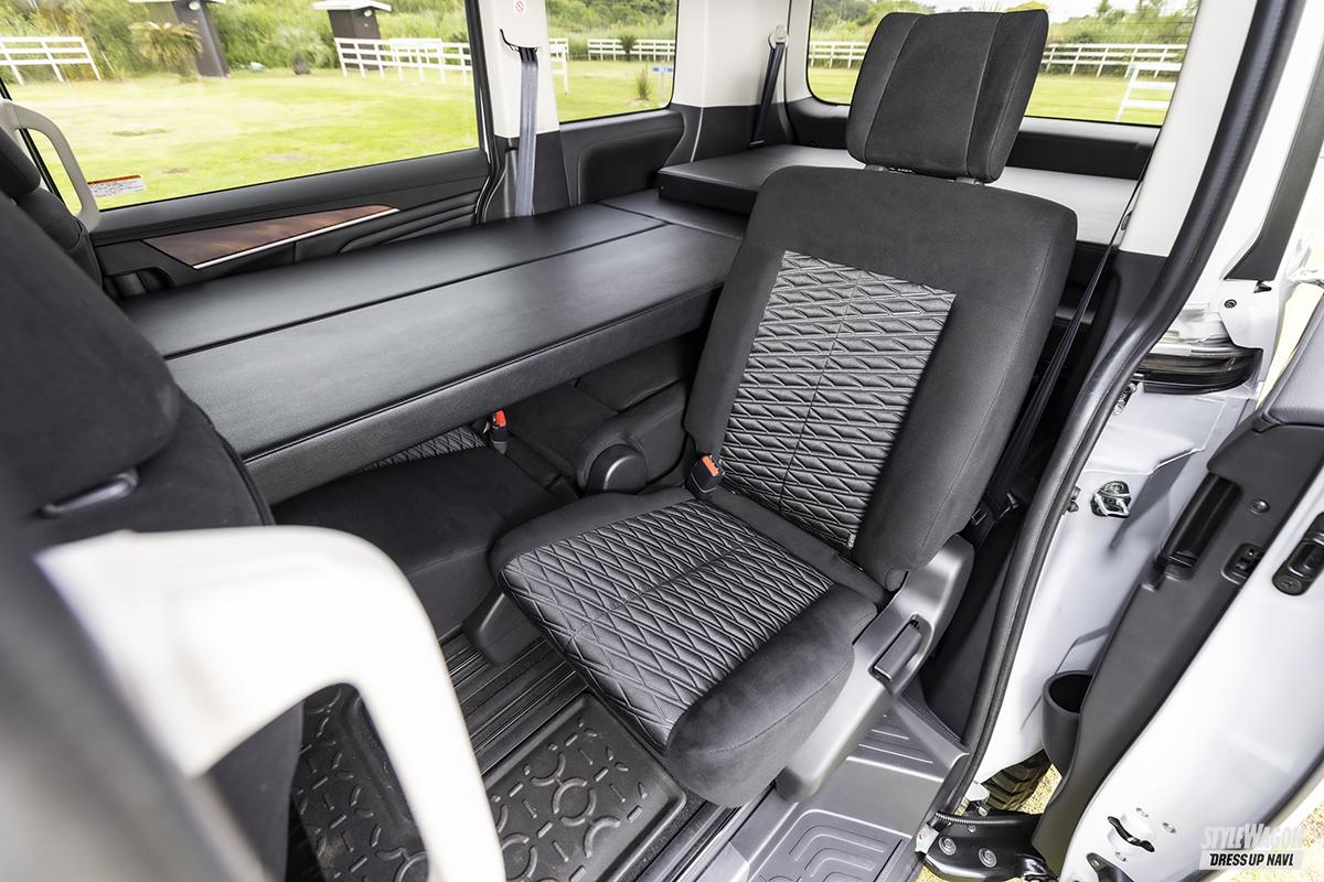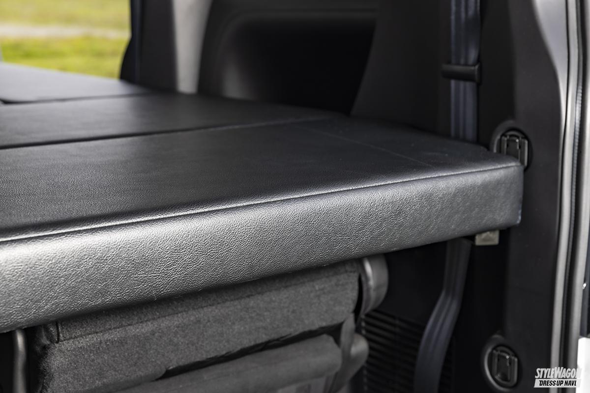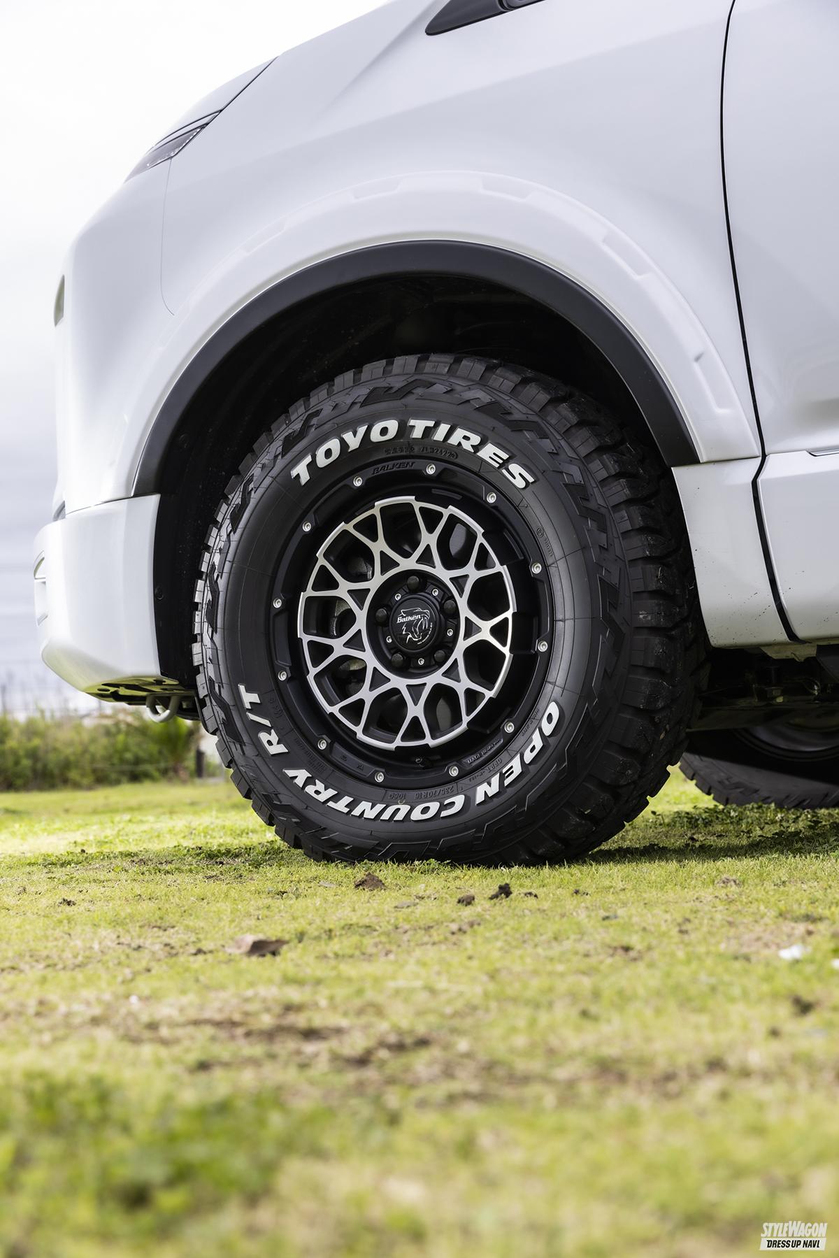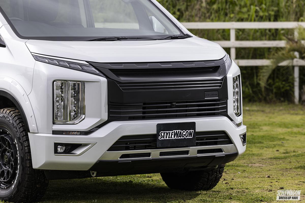 そのニューズデザイン製エアロはデリカD:5らしさをダイレクトに引き上げられる造形が魅力。純正の3連ダクトが印象的なフロントには、その精悍なイメージに合わせた立体ブロックデザインをあしらったアンダーガードを設定。すっきりと引き締まったデザインのフロントグリルとの相乗効果で、さり気なくオフ感を盛り上げている。
