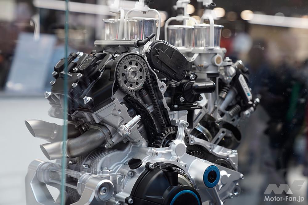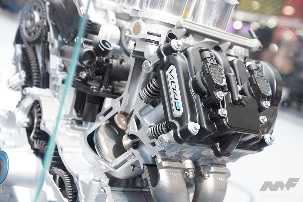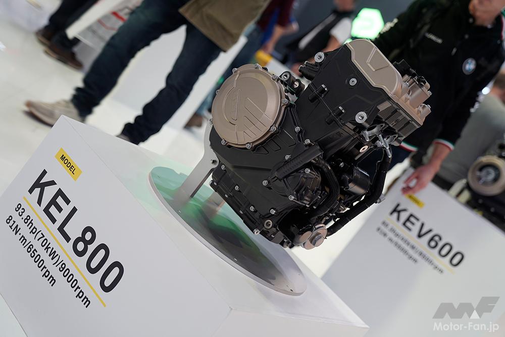 スーパースポーツ300世界選手権や、ダカールをはじめとするラリーにおいて存在感を高めているKOVE(コーヴェ)も、市販車に搭載している多彩なエンジンを単体で展示していた。小排気量スポーツモデルや競争力の高いラリーのホモロゲーションモデルには高性能な単気筒エンジンを搭載しているが、大型アドベンチャーモデル用の並列2気筒エンジンのほか、中間排気量のスーパースポーツや、それとプラットフォームを共有するストリートファイターのために並列4気筒エンジンも開発している。