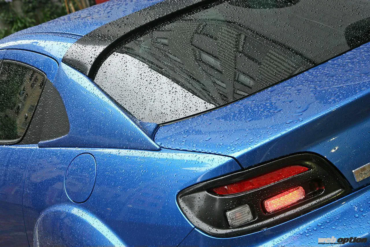 また、じっくりと全身を眺めていくと、ルーフ形状がRX-8と異なることに気付く。Cピラーにオリジナルパネルを装着することで、クーペ風の流れるスタイリングを構築しているのだ。