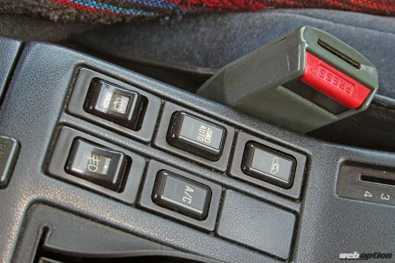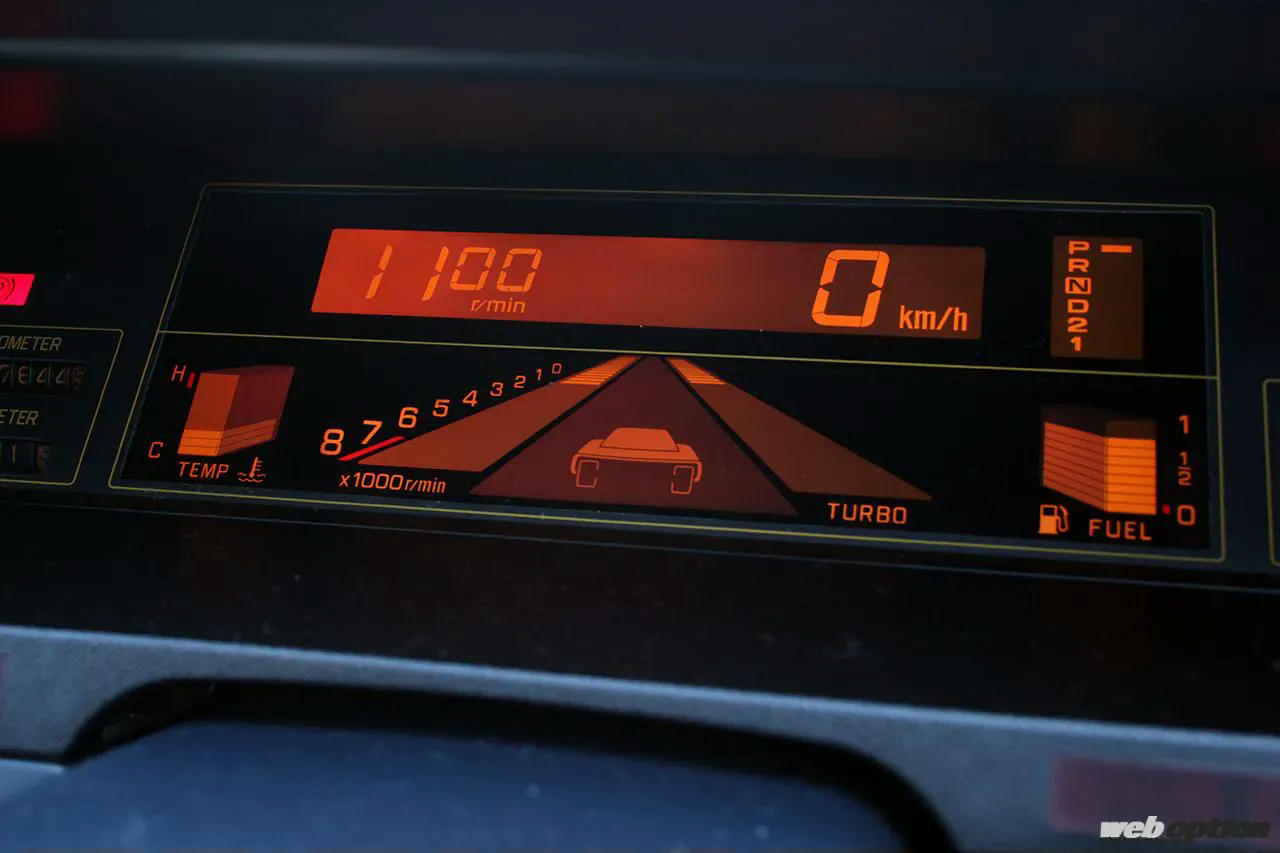 VRターボのAT車のみにオプション設定されていたエレクトロニック・インストルメントパネル。上段右にスピード、左にエンジン回転数がデジタル表示される。下段のバーグラフは右がブースト圧、左がエンジン回転数で、奥から手前に向かって伸びてくるのが違和感ありまくり。真ん中のイラストは車高や4WDモードを表す。