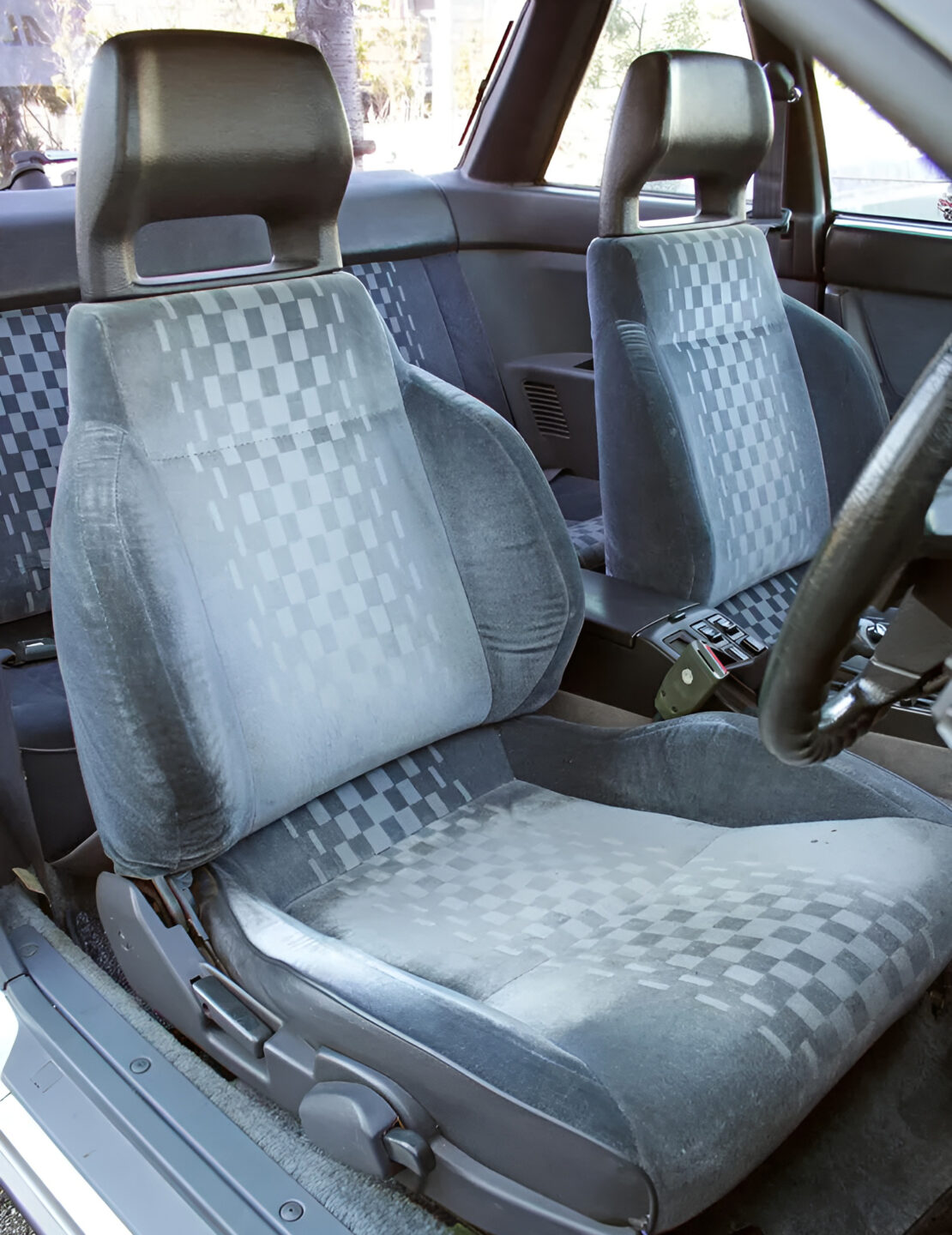 前席はスポーティタイプのセミバケットシートを装備。表皮には最高級モケットが使われ、運転席にはランバーサポートとシートリフター機能も備わる。