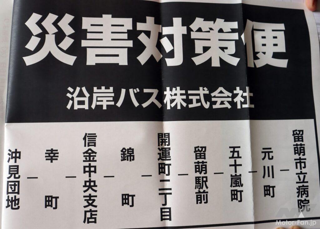 「沿岸バスは、道路運送法17条に基づく緊急措置として9日午後、沖見団地停留所(沖見町5丁目)~留萌市立病院間で災害対策便の運行を開始した。災害対策便は、沖見市立病院線復路(留萌市立病院-留萌駅前-留萌十字街-沖見町3丁目-沖見団地停留所)が9日午後2時56分から、同往路(沖見団地停留所-港南中学校前-留萌十字街-留萌駅前-留萌市立病院)が同3時8分からそれぞれ運行を開始。留萌市立病院行きの往路は7便、沖見団地停留所行きの復路は6便が運行している」。