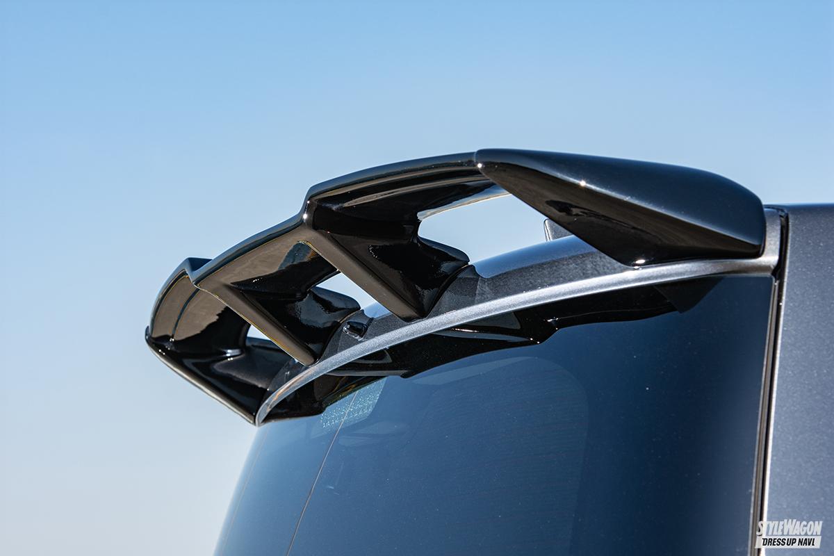 左右に4連ダクトを配置し、アンダーガード形状も取り入れたフロントのエクストリームバンパーは特に印象的。ファッション性と機動性とが絶妙にミックスされたフィニッシュで、ロングノーズ化を達成できるアグレッシブなフロントグリルとの組み合わせも精悍。純正よりも2.5㎏軽量なエアロボンネットにも大型インレットダクトと4連ルーバーを採用するなど、アグレッシブでワイルドな装いだ。