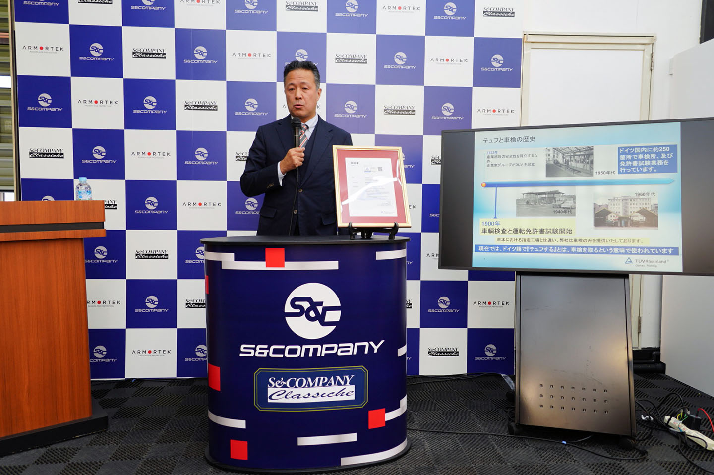 「エスアンドカンパニー」が「マツダ」「ヤナセオートシステムズ(ヤナセクラシックカーセンター)」「郷田板金」「ネッツトヨタ富山株式会社(GR Garage富山新庄)」に続く日本で5社目となるその認証を取得。今回、テュフラインランドジャパンの栗田隆司さんから、エスアンドカンパニー代表取締役社長・鹿田能規さんへと認定証が手渡された。