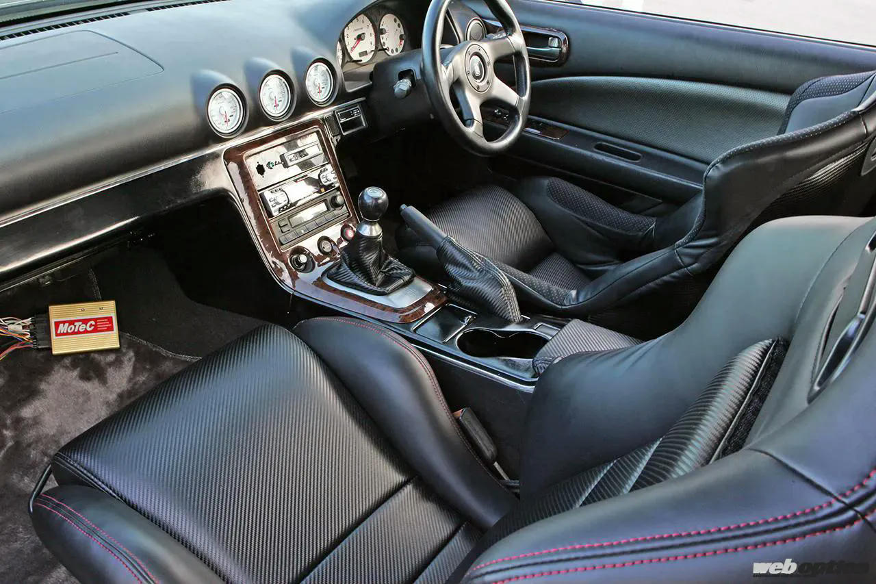 一方の室内は、ブラックを基調にローズウッドとカーボンをアクセントとしたシックなイメージで構築。バケットシートをSDRのレザーシートカバーで覆ったり、FRPドアにわざわざ純正内張りを付るなど、高機能をあえて隠すモディファイが施されているのだ。