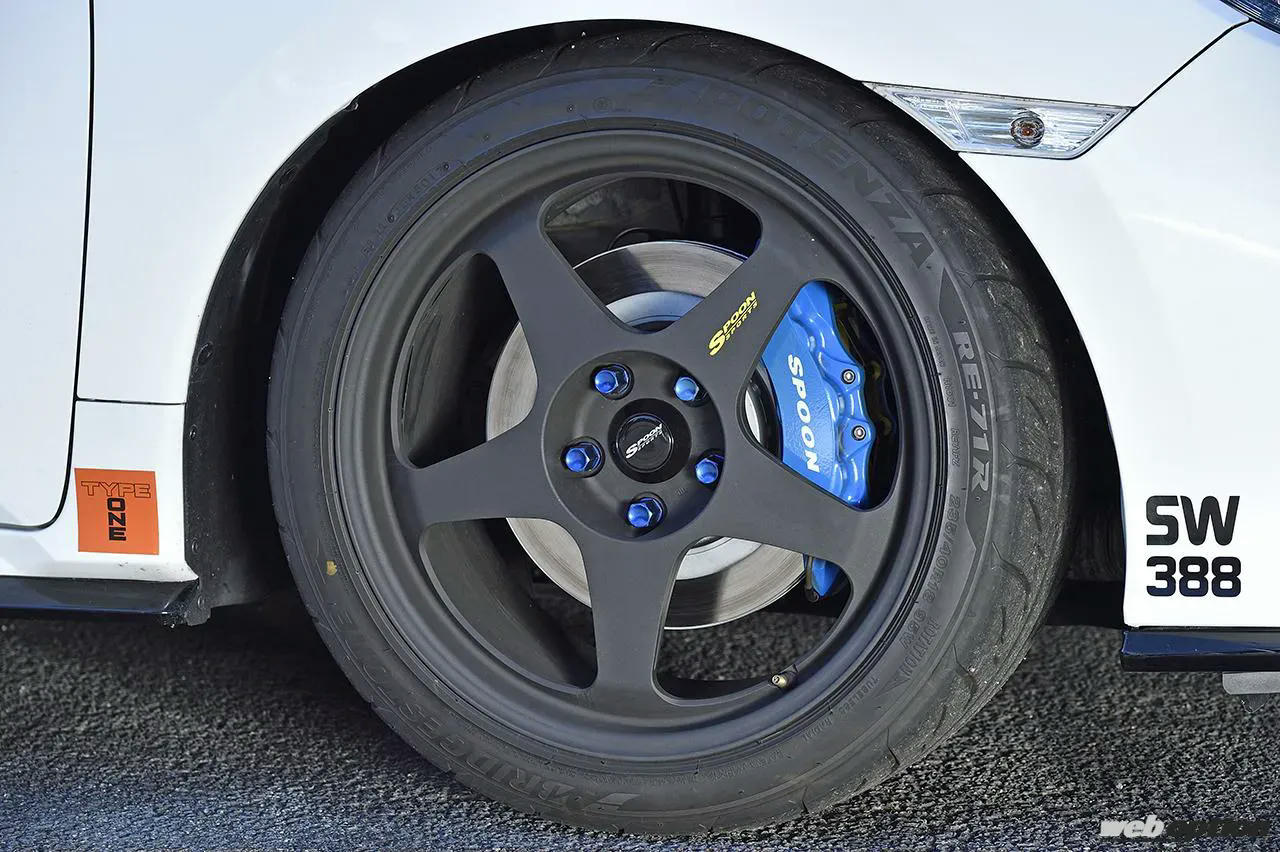 ホイールはオリジナルのSW388(8.5J×18+45)で、タイヤにはポテンザRE-71R(235/40-18)を組み合わせる。ブレーキは、フロントにオリジナルの6ポットキャリパーシステムを奢る。