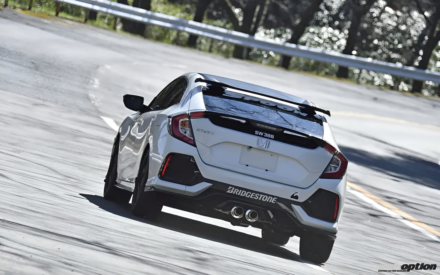 試乗したOPTION顧問の稲田大二郎は「タイプRではないけど、ただのシビックハッチでもこれだけパワーアップしてあれば手強い! 驚いたのは270psというパワー感より、ハードなサスとコーナリングでの強烈なLSDの効きだ。アクセルオンでグリップしながらグイグイ切れ込んでいき、パワーを使い切ることができる。FFで速く走らせるノウハウを、スプーンは熟知しているんだろう」と、その走りの質の高さに衝撃を受けた様子。
