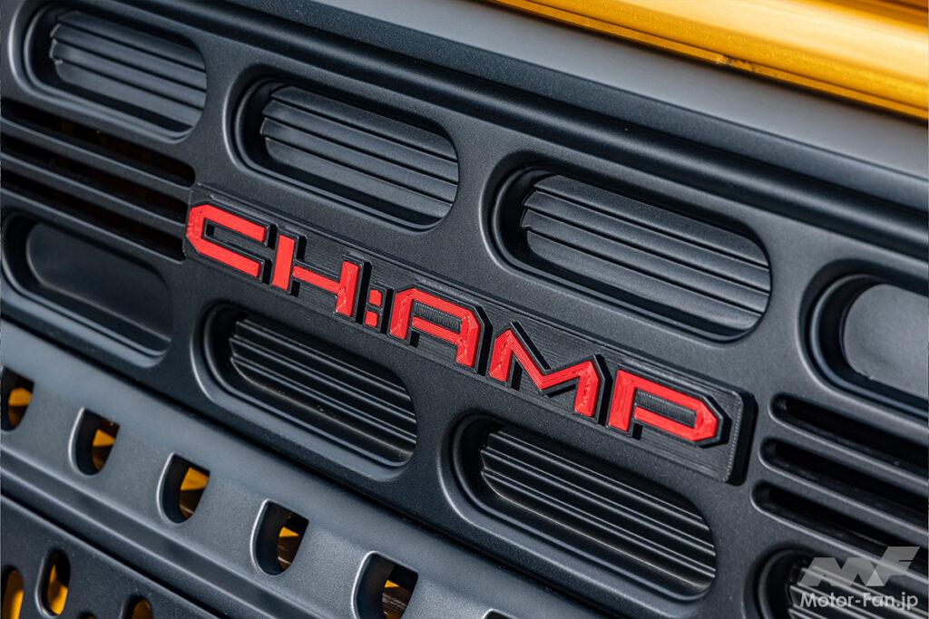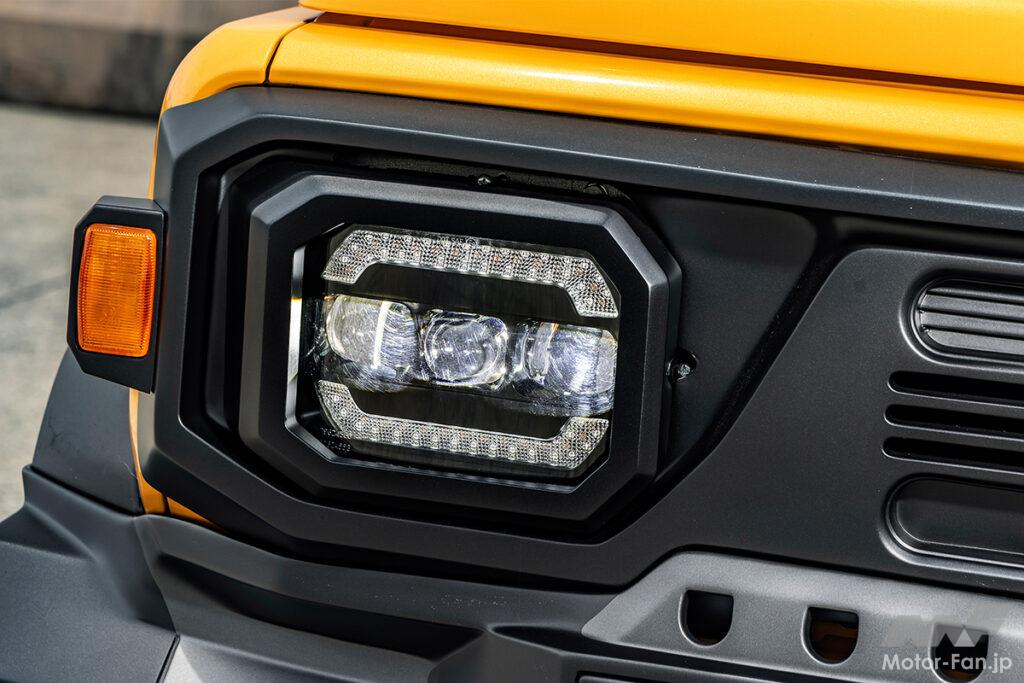 ジムニーシエラ&ジムニーノマド専用のフェイスチェンジキットは、4WDならではの精悍さと都会的なスタイリッシュさを併せ持つデザインが魅力で、複雑な造形でありながら純正ボデイに違和感なく溶け込むよう仕立てられている。パーツ構成はフロントグリル、フロントバンパー、そしてヘッドライトが一体となる構成で、街中で走るクルマを正面から見かけたら、ジムニーとは思えないワイルドを打ち出している。特に八角形仕様のヘッドライトは、3連プロジェクターとコの字型のポジションランプを内蔵しており、強力な目ヂカラで圧倒的な存在感を放っている。