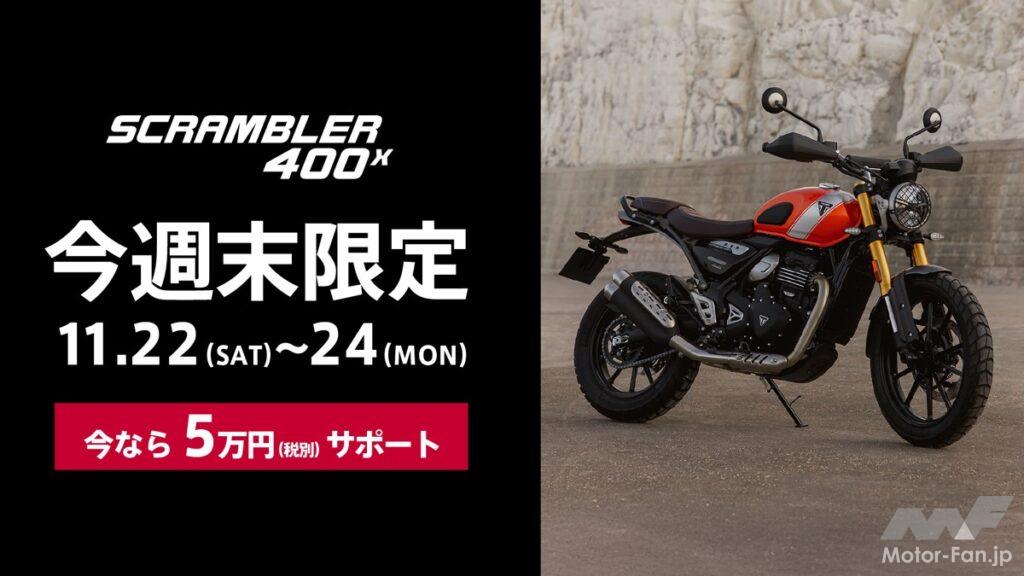 トライアンフモーターサイクルズジャパンは、11月中の週末3回にわたり「週末限定5万円サポート」キャンペーンを実施する。対象は400ccクラスの人気モデルで、11月8~9日は「SCRAMBLER 400 XC」(94万9000円〜)、15~16日は「SPEED 400」(75万2000円〜)、22~24日は「SCRAMBLER 400 X」(84万2000円〜)の新車成約者に税別5万円の購入サポートが提供される。全国の正規販売店で実施され、他のキャンペーンとの併用も可能。同時期には試乗イベント「TRIPLE EXCITING FAIR」も展開され、400シリーズの魅力を体感できる。英国の伝統を継ぐブランドが、手に届く価格でプレミアムな走りを提案する機会となる。