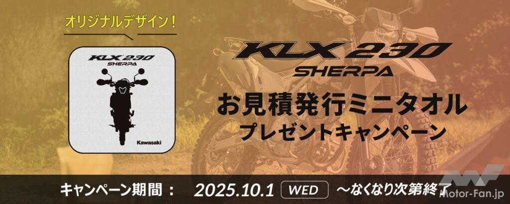 カワサキモータースジャパンは、全国のカワサキ正規取扱店にてKLX230 SHERPAおよびKLX230 SHERPA Sの新車を見積もり申し込みした顧客全員に、限定デザインのオリジナルミニタオルをもれなくプレゼントするキャンペーンを2025年10月1日より開始した。キャンペーン期間中、対象モデルの見積もり発行が条件となり、ミニタオルはなくなり次第終了となる。対象店舗は全国のカワサキ正規取扱店。