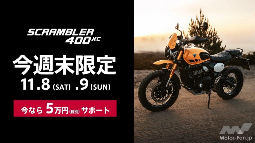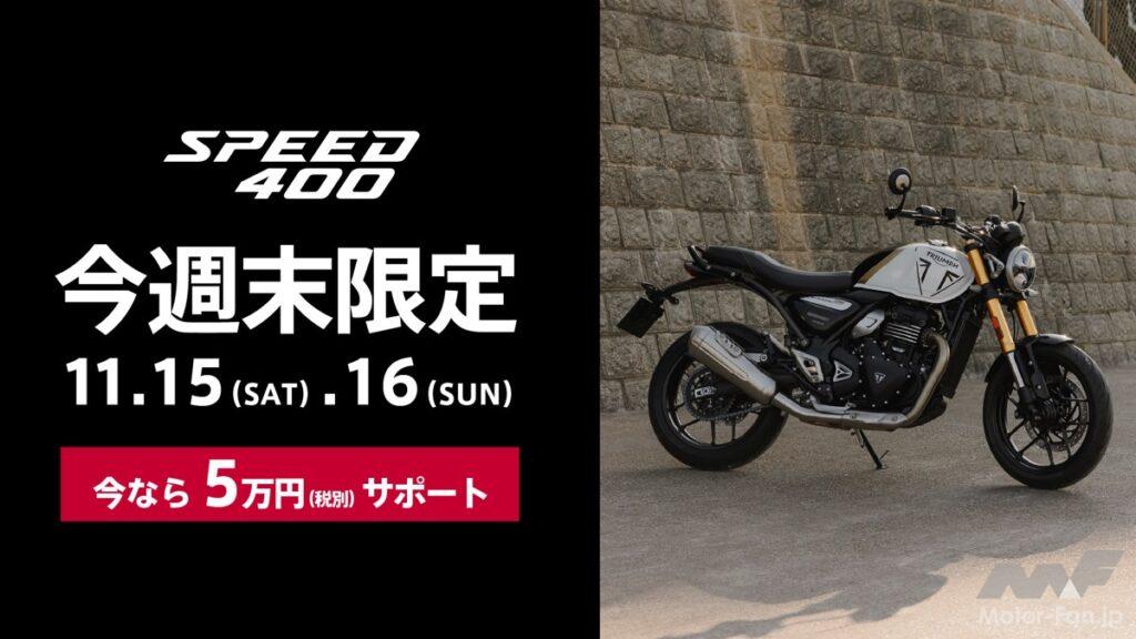 トライアンフモーターサイクルズジャパンは、11月中の週末3回にわたり「週末限定5万円サポート」キャンペーンを実施する。対象は400ccクラスの人気モデルで、11月8~9日は「SCRAMBLER 400 XC」(94万9000円〜)、15~16日は「SPEED 400」(75万2000円〜)、22~24日は「SCRAMBLER 400 X」(84万2000円〜)の新車成約者に税別5万円の購入サポートが提供される。全国の正規販売店で実施され、他のキャンペーンとの併用も可能。同時期には試乗イベント「TRIPLE EXCITING FAIR」も展開され、400シリーズの魅力を体感できる。英国の伝統を継ぐブランドが、手に届く価格でプレミアムな走りを提案する機会となる。