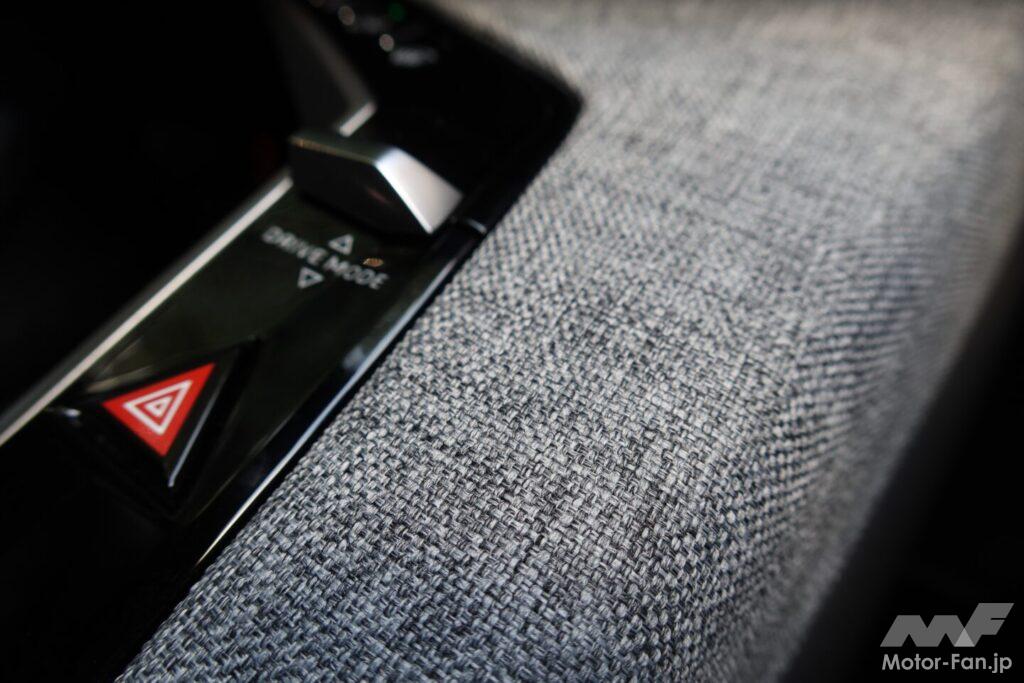 インパネからドアトリム、そしてセンターコンソールにかけてはテキスタイル(織物)調のトリムが配されている。ボルボEX30にもこの手のトリムが設定されているが、温かみのある質感だからか、筆者の好みだ。インパネからセンターコンソールにかけてはドライバー側とパッセンジャー側を明確に仕切った左右非対称の造形となっており、テキスタイル調トリムがあるドライバー側にはハザードやデフォガーなどのハードスイッチが並んでいる。張り出したインパネとセンターコンソールの隙間にある空間がスマホを置くトレイ(ワイヤレス充電機能付き)だ。