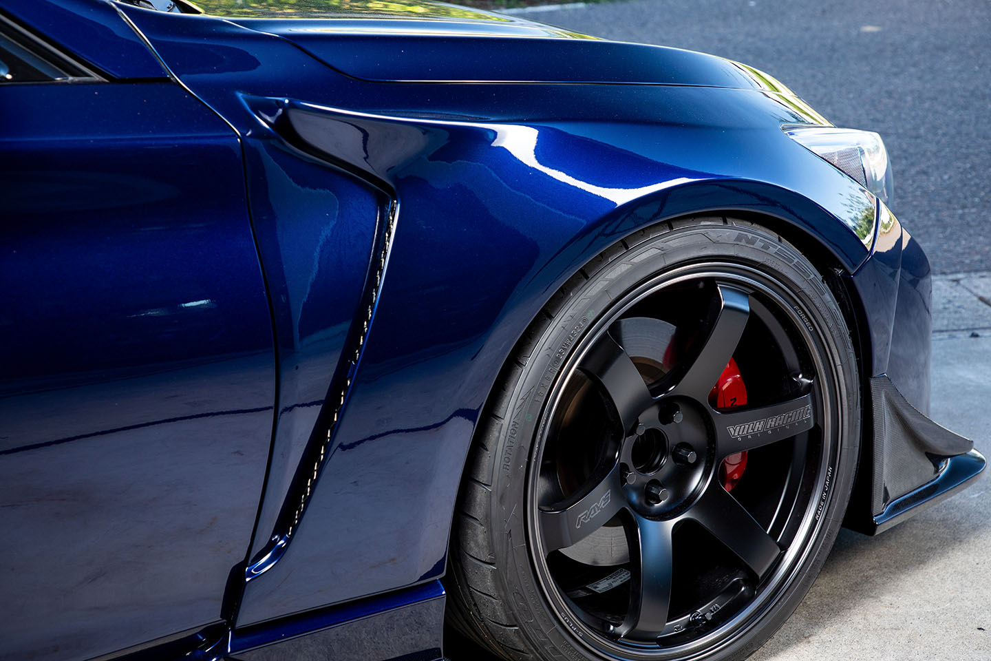 ワイド幅は前後ともに片側20mmで、R35GT-Rのリヤ用10.5Jプラス25サイズを純正アームのまま収められる設計となる。ちなみに、フロントフェンダー(17万6000円)のデザインは、R35GT-RニスモNアタックのイメージを取り入れたダクト&スポイラー形状を採用。曲面の構成はBMW M3をオマージュしている。