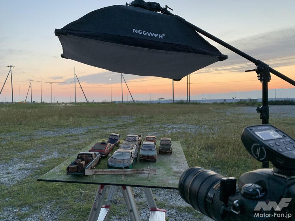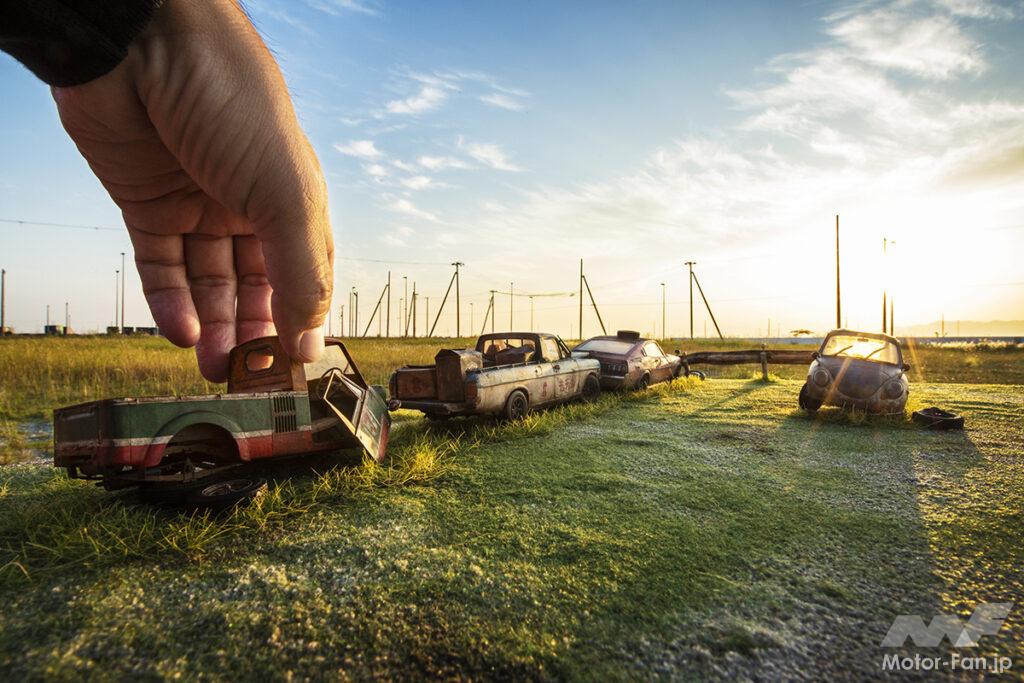 連載第2回なので、ちょっと進みます(笑)。PAPANが撮影した写真。廃車風に作り込まれたサニトラやダルマセリカ、テントウムシが、キラキラとした夕焼けに照らされた、まさに映える写真ですが、これリアルに見えますよね。実際はプラモから手前は全て作り物。その後ろの背景がリアルな風景なんです。いかにしてリアルに見せるか。プラモ手前の草はプラモに合わせたサイズ感で作るのが大前提ですが、実際の背景との違和感をなくすには、プラモから後ろのボケ感が重要です。プラモまでにピントを合わせて後ろをボケさせることで、このようなリアルな感じを作り出せるんですね〜。PAPANはプロカメラマンなので1眼レフなど高価な機材を持ってますが、実はスマホのポートレートモードで撮影すれば、または編集アプリでイジれば近い雰囲気を作り出せると思います。今度、誌面でも実践してみましょう!