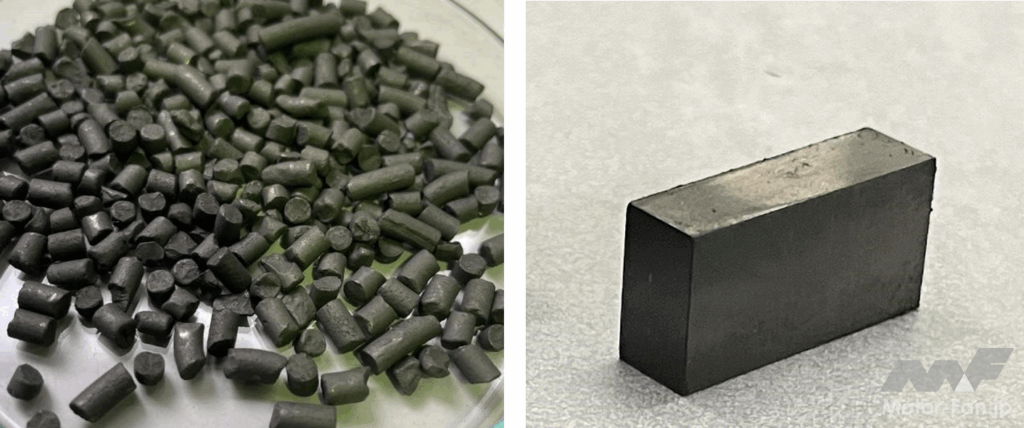 左:窒化鉄系磁石の射出成形ペレット、右:圧粉成形磁石さらに、ミツバが強磁性窒化鉄系磁石を車載電装モータ※6として設計・評価した結果、モータの特性において、試験片で得られた磁気特性を考慮した計算値と実測値がほぼ一致することが確認された。