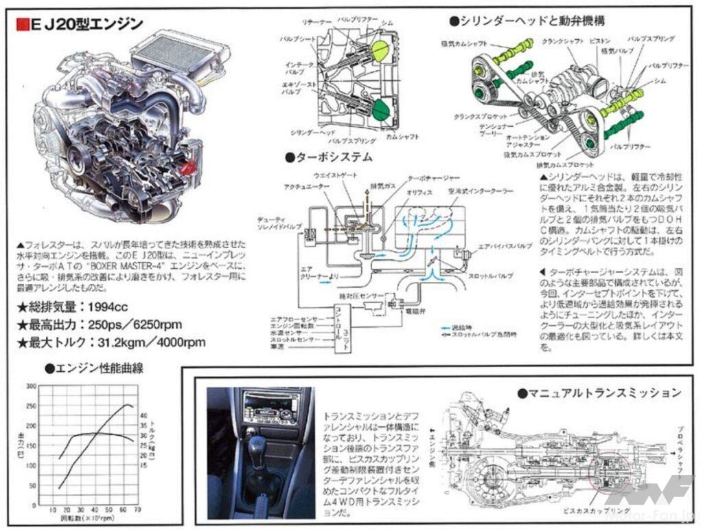 全長を10mm短縮して取り回し性を向上させ、ボディ剛性を高めながら軽量化も実現。また、スタイリングは先代を踏襲した躍動感ある面構成で、インテリアはスポーティな空間が演出された。パワートレインは、137ps/19.0kgmの2.0L 水平対向4気筒SOHC、220ps/31.5kgmのDOHCインタークーラーターボエンジンの2機種と、5速MTおよび4速ATの組み合わせ、駆動方式は当然フルタイム4WDである。