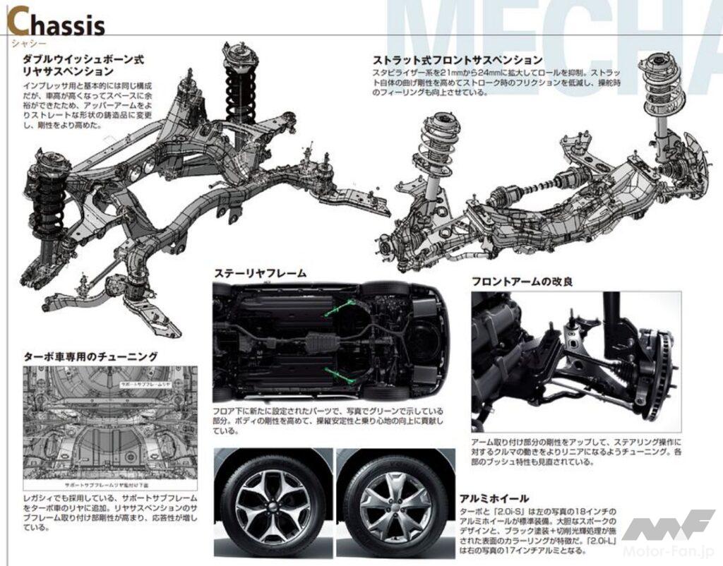 パワートレインは、先代から引き継いだ148ps/20.0kgmの水平対向2.0L 4気筒 DOHC、280ps/35.7kgmのDOHC直噴インタークーラーターボの2種エンジンと6速MTおよびリニアトロニックCVTの組み合わせ。