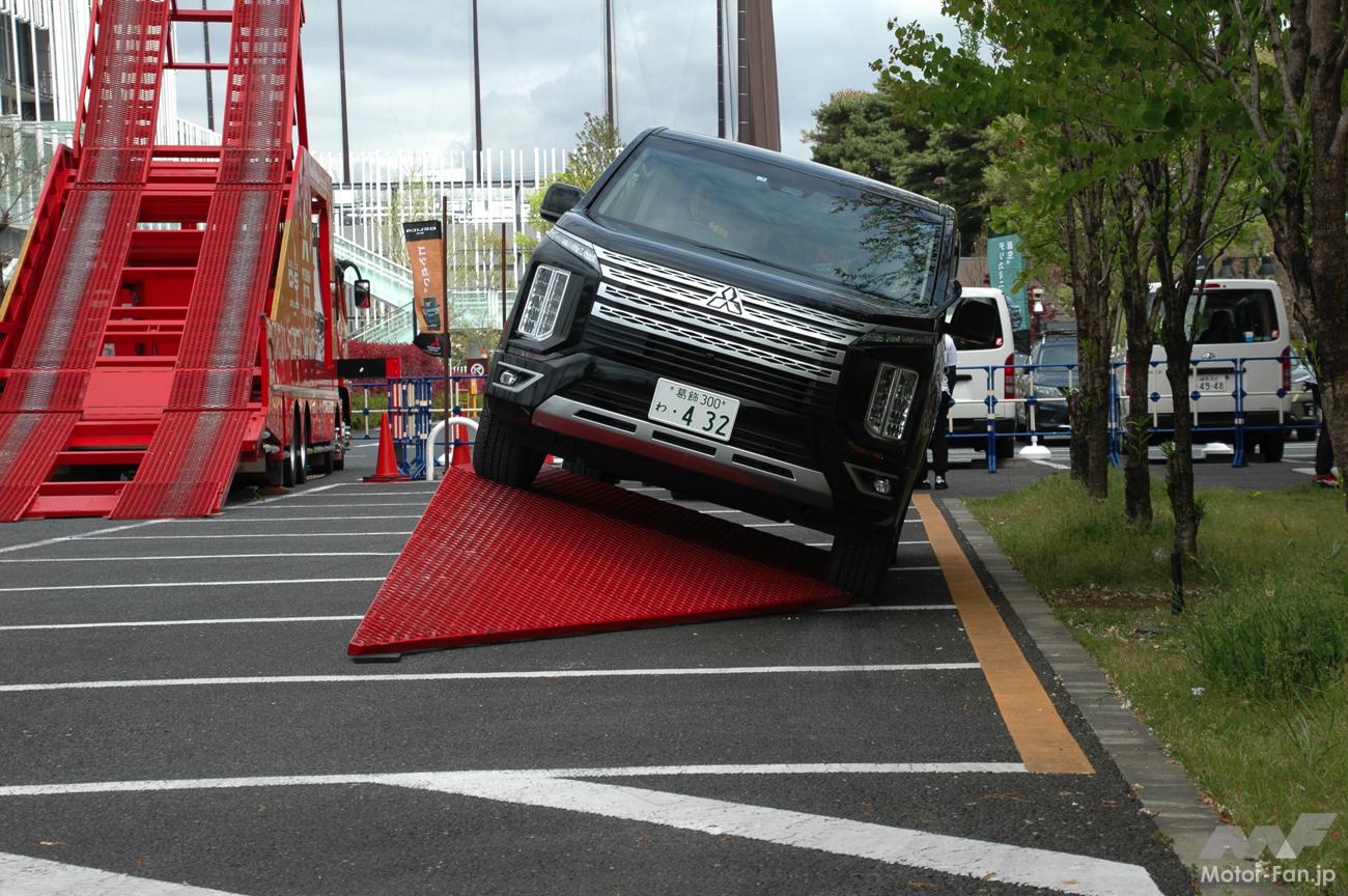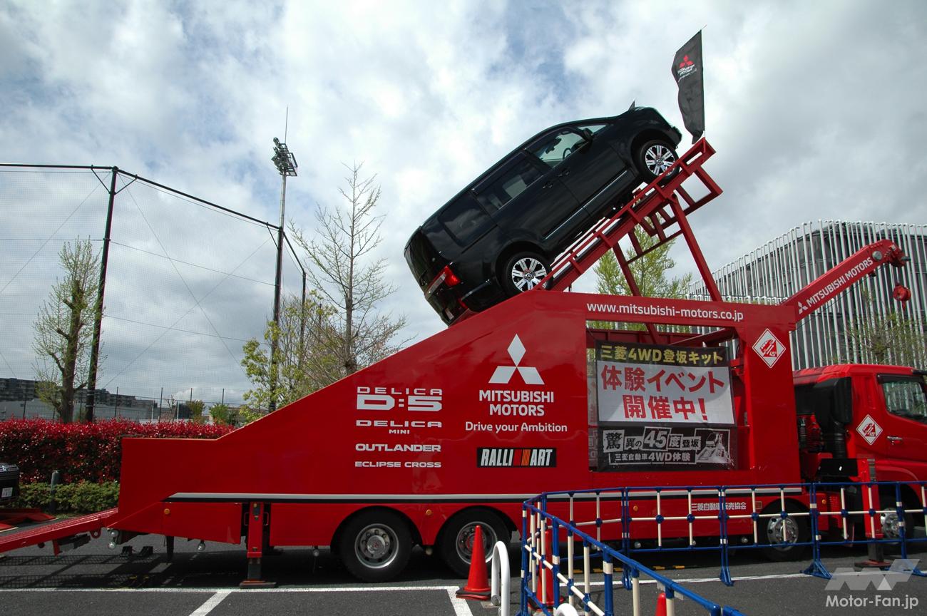 同イベントでは参加型プログラムとして、デリカD:5によるオフロードキットと登坂キットの同乗体験走行が用意されており、来場者はデリカD:5のミニバン離れした走破性を堪能した。このキットは三菱のイベントではおなじみで、パリダカールラリー優勝経験もあるラリードライバー・増岡浩氏を初め、三菱の実力はドライバーがステアリングを握り同乗者にその走破性を紹介するものだ。
