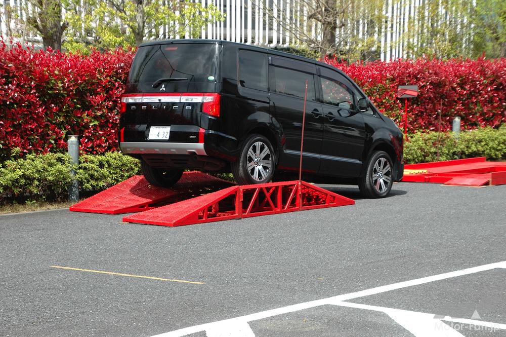 今回、一般来場者の同乗こそなかったものの、デリカミニもこのオフロードキット走行を披露した。残念ながら登坂キットこそ走行しなかったものの、横傾斜路、凸凹路、スリップ路の3つをデリカD:5同様に走行している。