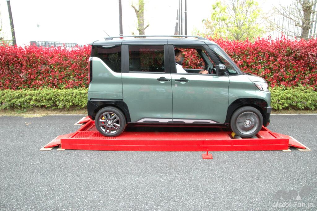 しかし、クルマは危なげなく傾斜路をクリア。同乗してもわかることだが、大きな開口部と広い空間を備える軽スーパーハイトワゴンでありながら、このような状態でもボディは軋みひとつ上げず、車体を意図的に揺らしても安定したままだ。