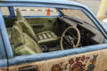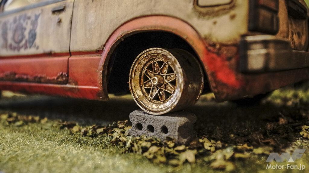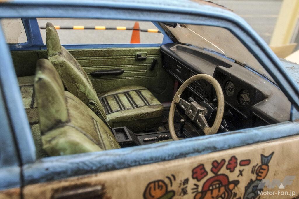 当時はもっと鮮やかだったんだろうなと想像できるトリコロールカラーは時の流れを感じさせるよう絶妙に色あせ、その周囲はサビで塗装も剥がれる始末。ホイールも内装も同様にヤレて、フロントウインドウなんて近所のガキんちょの仕業でしょうか。ボールが当たってヒビ入っちゃってるし。とまあ情景を想像できるのがこのアルト。PAPAN部長に作り方を聞いてみると、ボンネットの剥がれはカッターなどで部材を僅かにめくるように削り、ボンネット面と剥がれ面の境界線を作っているそうです。それを境に塗り分けるということですね。写真で見ると剥がれ面は全体的に削って1段落ちているように見えますが、実際は違うんですね。ボンネットやホイールのサビ部分の塗料は、タカラ塗料の錆エイジング用、シートやボディ全体の汚れはミスターホビーのウェザリング塗料を使っているそうです。