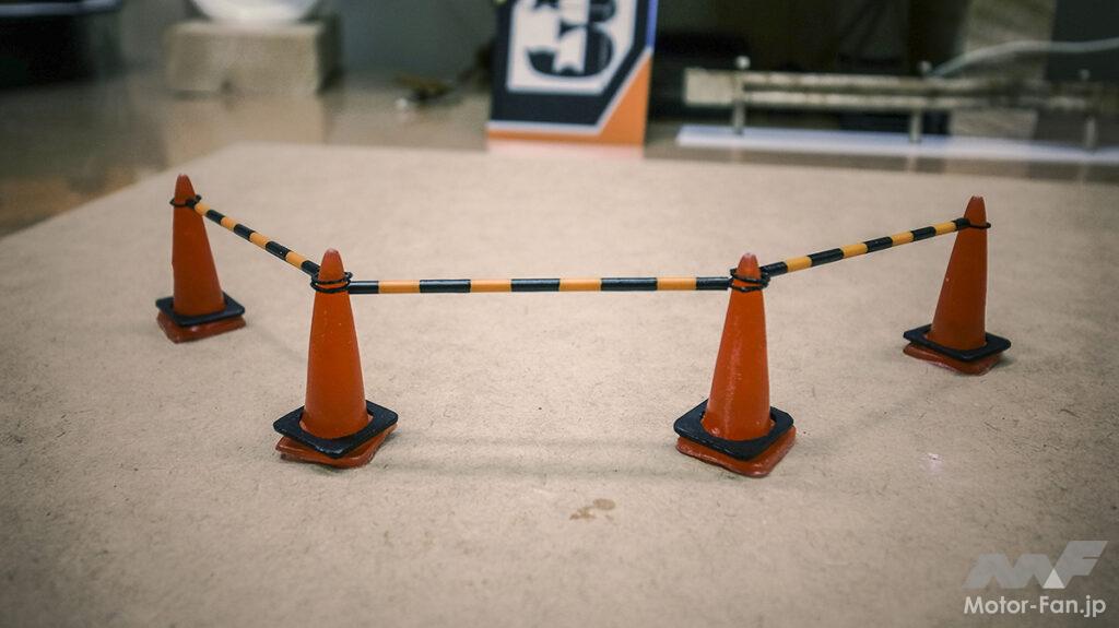 まずバットとボールは、タミヤなどから出てるエポキシパテで造形。エポキシパテは粘土のように造形して、硬化後も削れるので、形を作りやすいです。そして赤コーンですが、まずはバット同様エポキシパテで1つ形を作ります。それに、お湯で柔らかくする粘土「お湯プラ」を被せて型を作ります。型に流し込むのは、UVレジン。バットなど1本物を作る際はエポキシパテだけで良いですが、同じ物を量産したい場合は、型を作る方が効率がよいのです。ちなみに赤コーンの重しはプラ板、黄×黒のポールはプラ材の丸棒で作っているそうです。どれをとってもかなりの手間ですが、小物がないと、ストーリーは伝わりません。それだけ小物作りって大切なのです。と、今回はここまで!