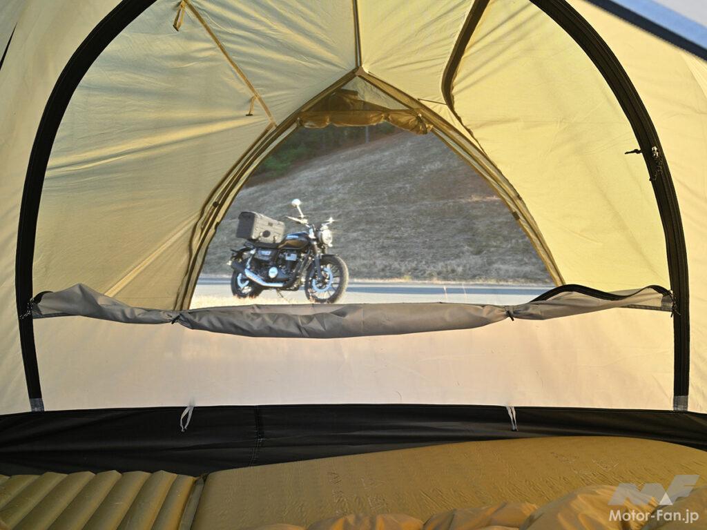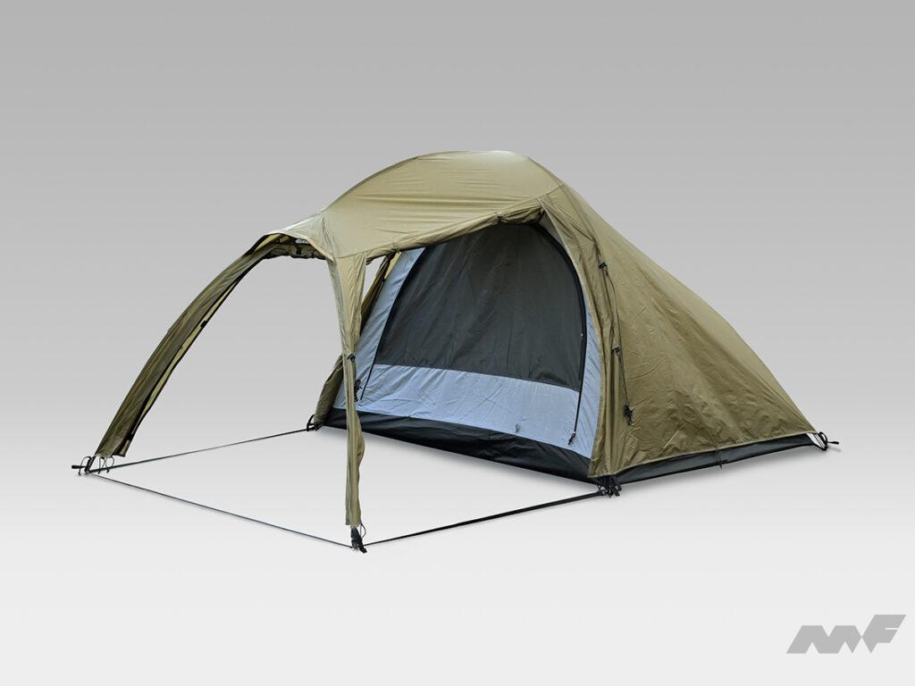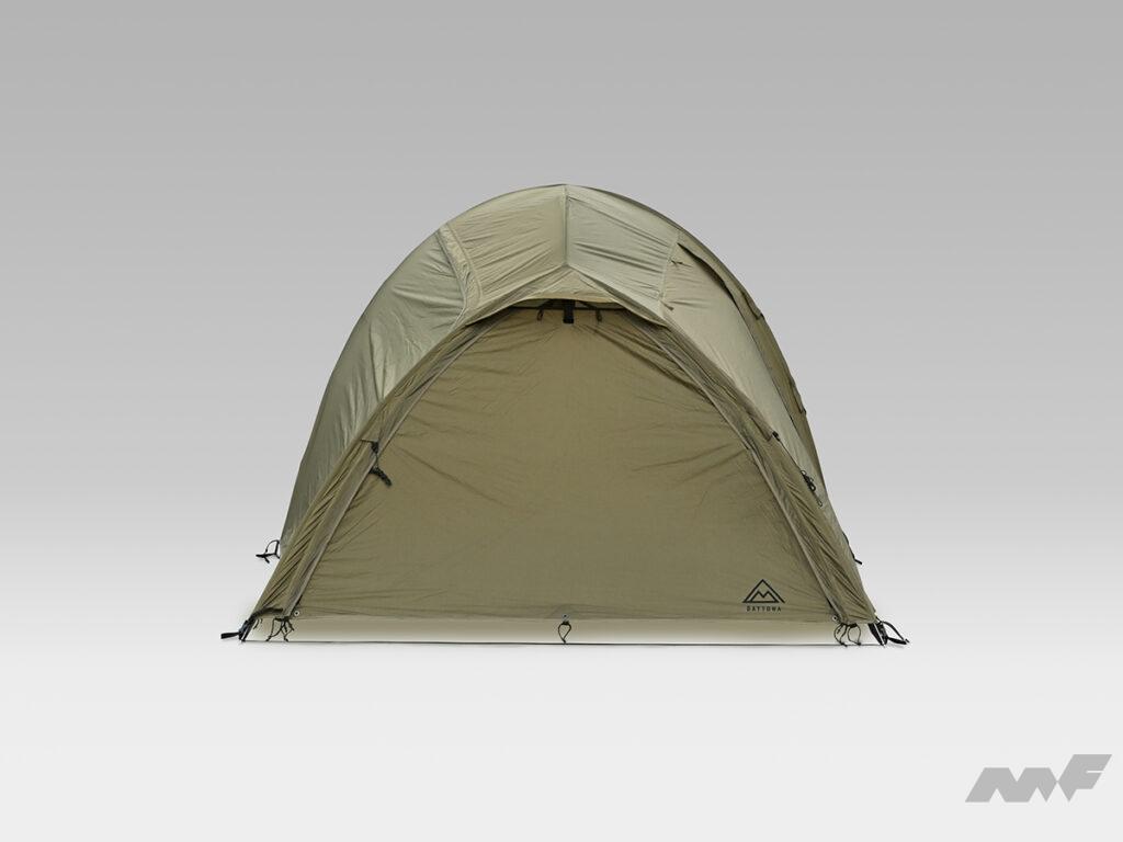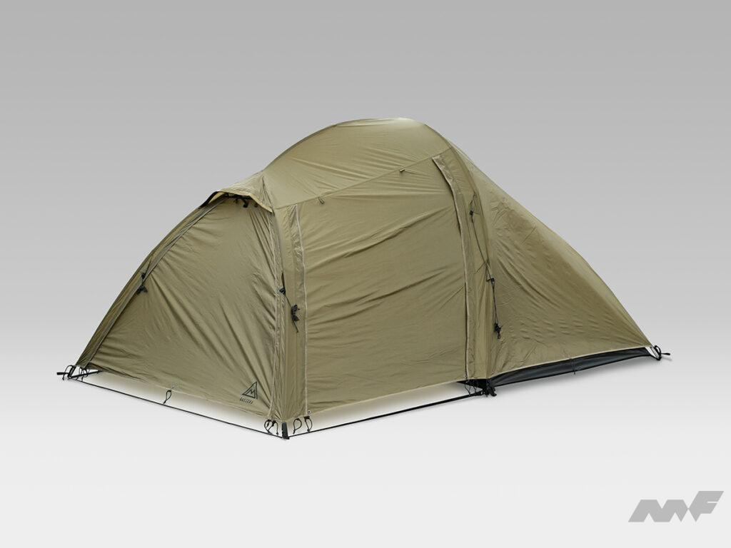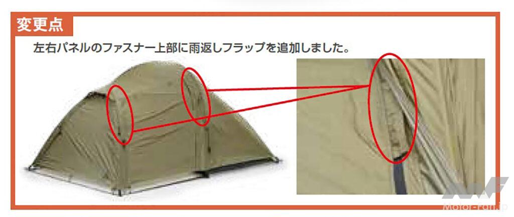 広々した前室が特徴の2人用ツーリングテント「マエヒロドーム デュオ」がリニューアル。左右パネルのファスナー上部に雨返しフラップを追加して、さらに利便性を向上させた。