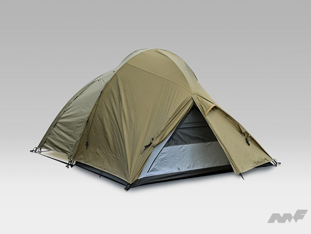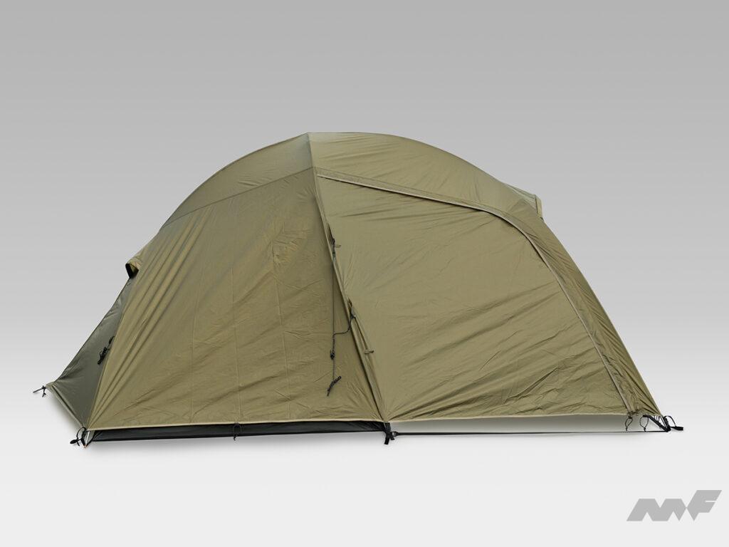 「マエヒロドーム デュオ」は1人用のマエヒロドームに比べ、床面積32%アップ。後室も追加して、さらに使いやすくしているのがポイント。スペースを贅沢に使用したいソロキャンプにもおすすめだ。
