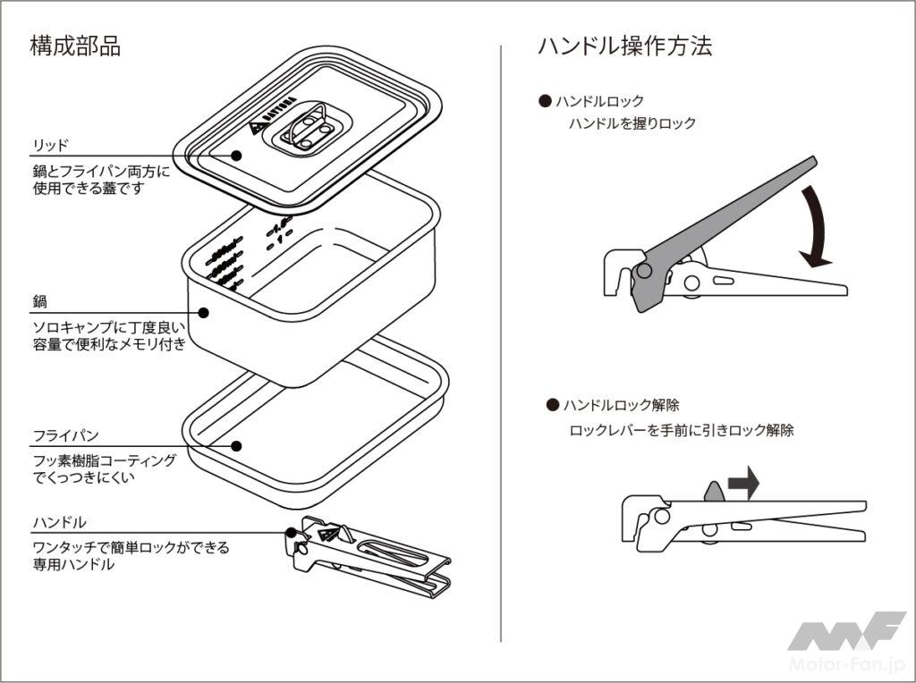 「クリップクッカー」は簡単に脱着が可能な、ワンタッチロック機構付きのハンドル、焦げ付き防止加工を施したフライパン、ハードアルマイト加工を施した鍋とリッド、収納袋が1セット。