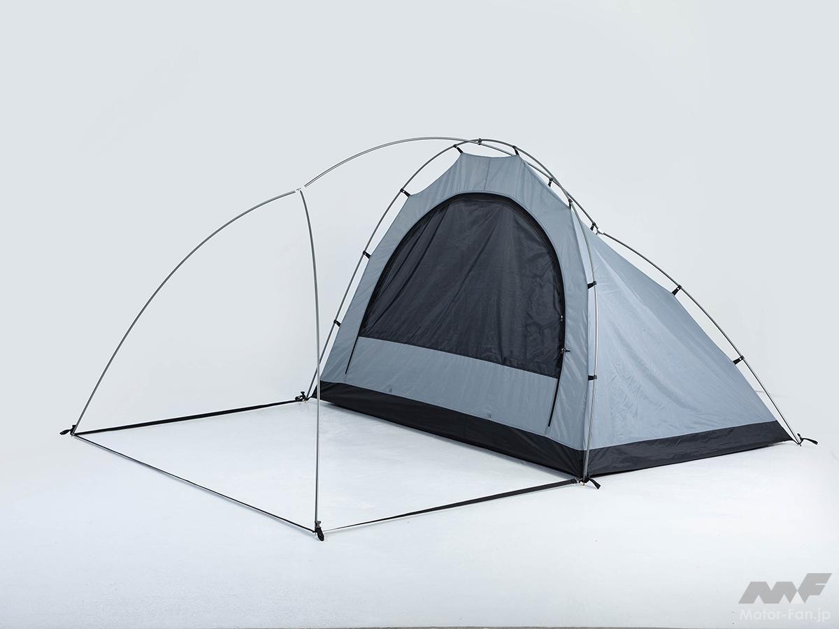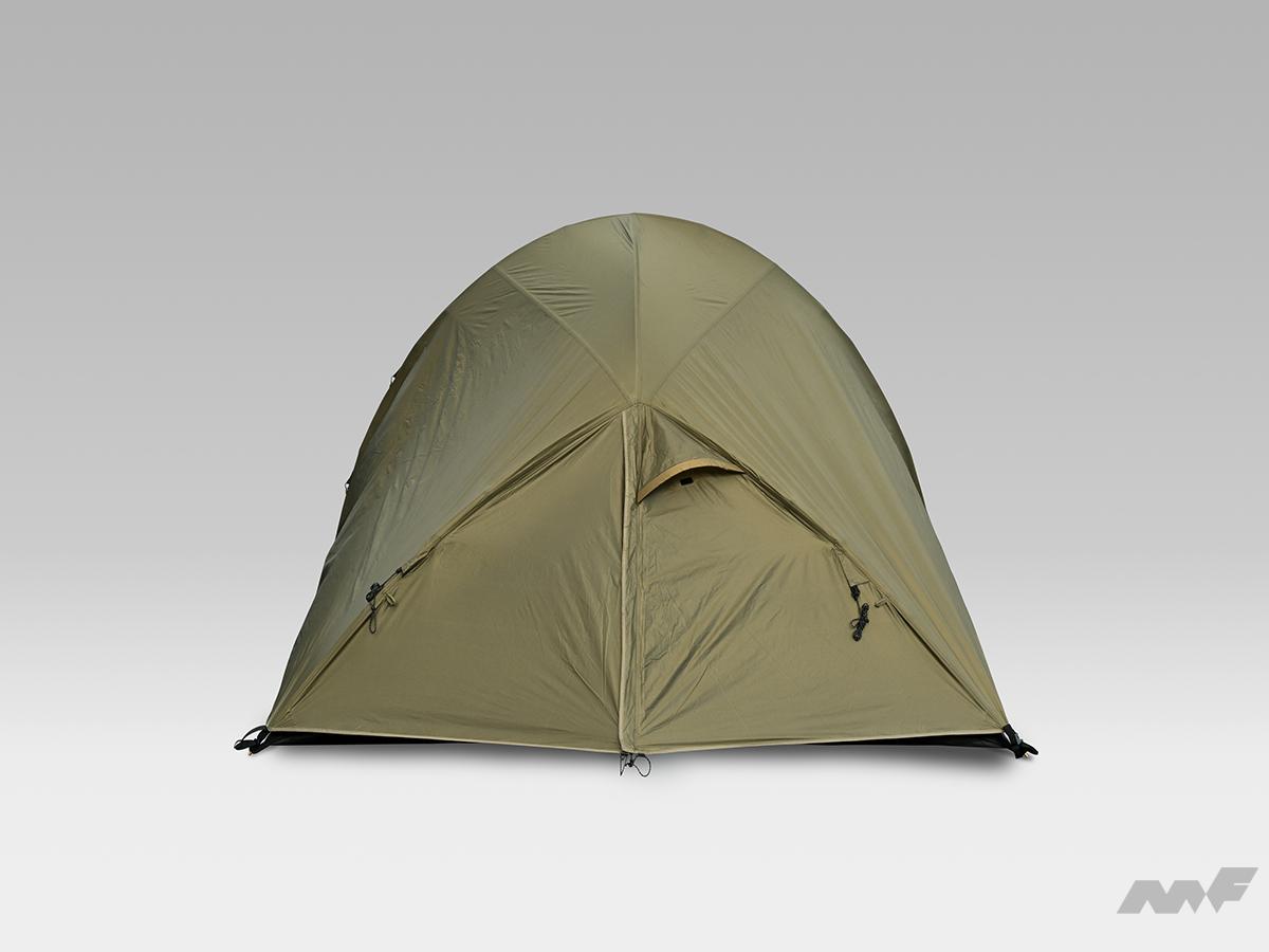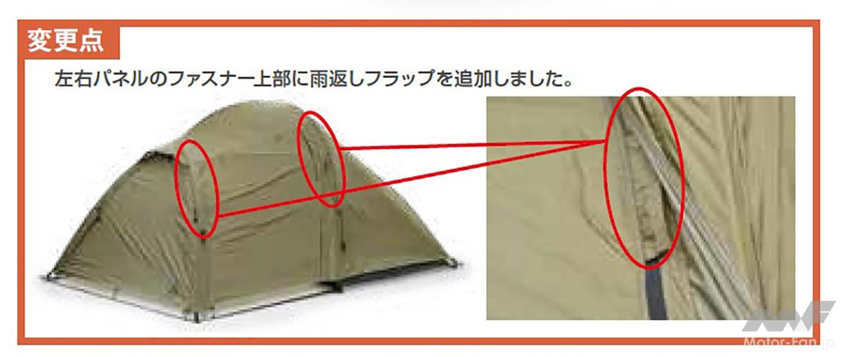 広々した前室が特徴の2人用ツーリングテント「マエヒロドーム デュオ」がリニューアル。左右パネルのファスナー上部に雨返しフラップを追加して、さらに利便性を向上させた。