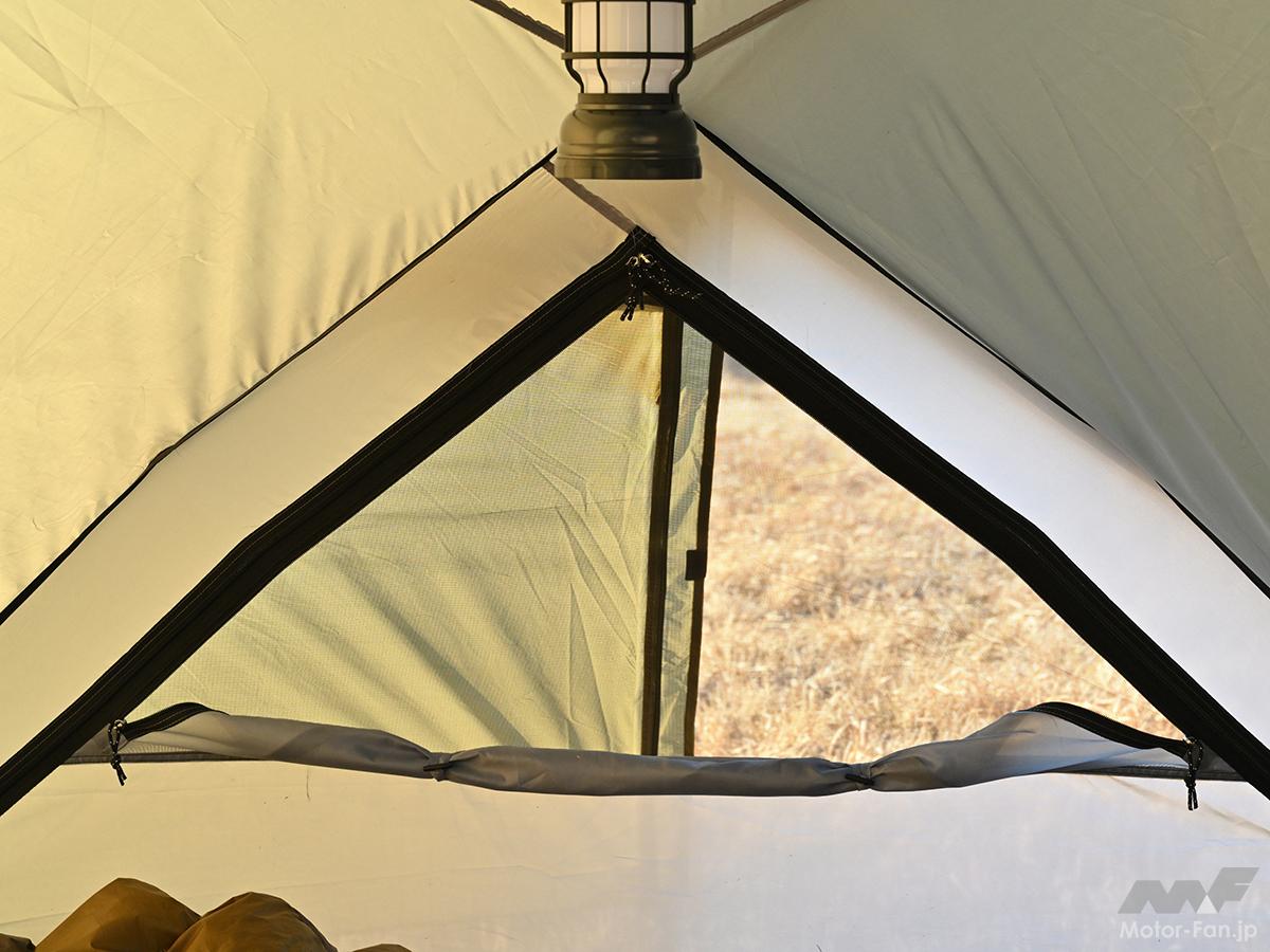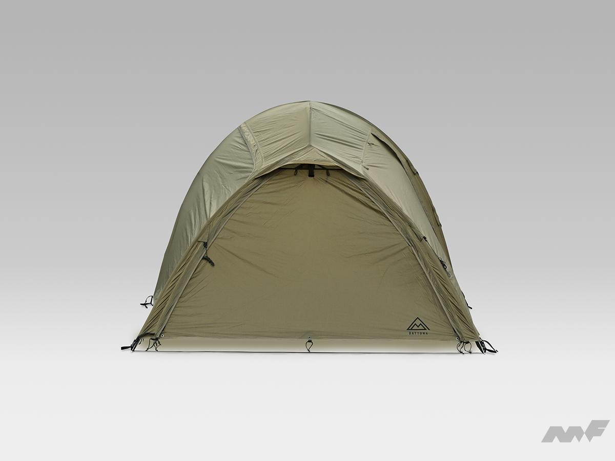 「マエヒロドーム デュオ」は1人用のマエヒロドームに比べ、床面積32%アップ。後室も追加して、さらに使いやすくしているのがポイント。スペースを贅沢に使用したいソロキャンプにもおすすめだ。