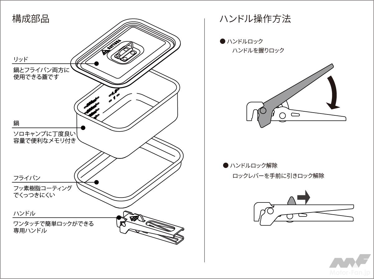 「クリップクッカー」は簡単に脱着が可能な、ワンタッチロック機構付きのハンドル、焦げ付き防止加工を施したフライパン、ハードアルマイト加工を施した鍋とリッド、収納袋が1セット。