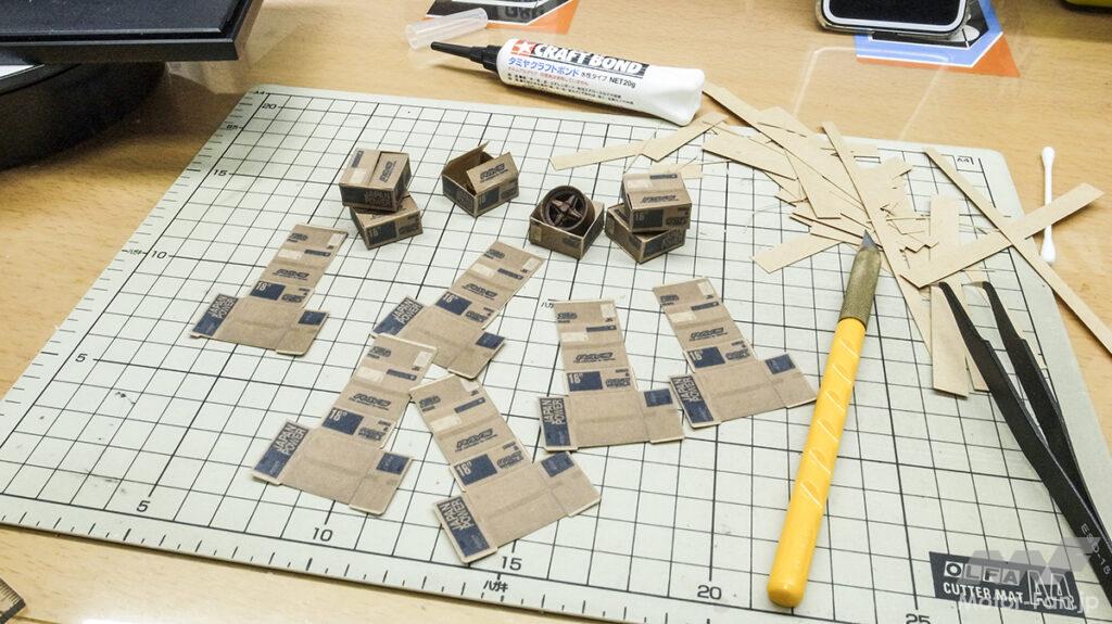 これ実は、ホイールメーカー、レイズの本モノのホイール用段ボール箱を忠実に再現したものなのです。またクセのあるこだわりを見せていますが、作り方は、まず本モノの段ボールを全面撮影し、それをクラフトペーパーに印刷。切り出してサイコロのように組み上げていくのです。何個作ったんですかね。見える範囲だけでも15個位あります。さらにリアル感を高めるために塗装が剥がれ腐食したホイールもだいぶ散乱してますね。