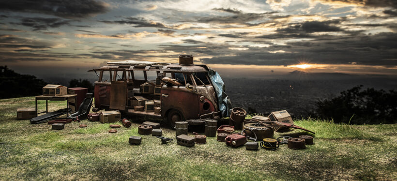 今回の魅せプラモ部は、PAPAN部長作のVW・タイプⅡ。街を見下ろす背景と、味わいのある空が広がっておりますが、注目はそこではなく、車外や荷室に散乱している段ボールです。