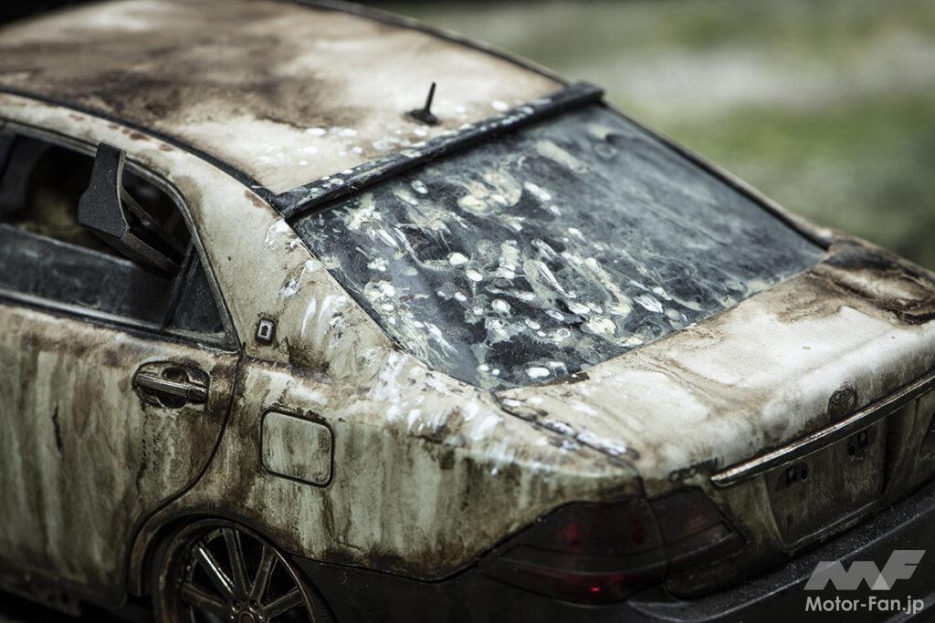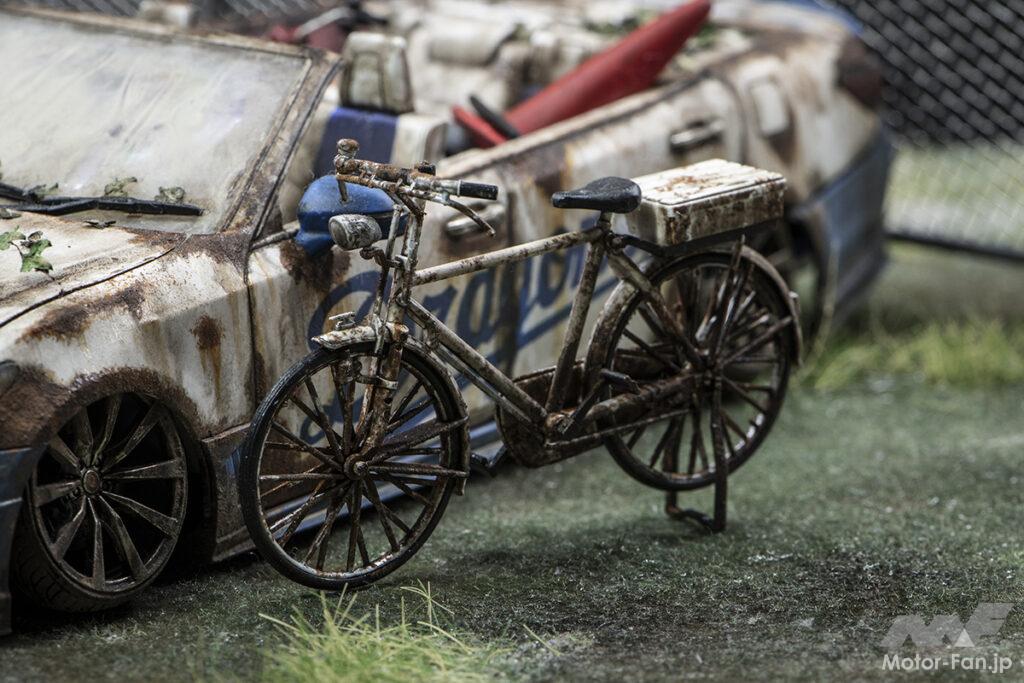 また、クルマの周囲にも自転車や、なぜか整然と並べられたモンキー、そしてホイールを盗もうとしたのでしょうか、フロアジャッキも置かれています。これら小物があることで、この廃車が過ごしてきた時間の流れや、こうなってしまった背景などが想像できるようになるのです。PAPAN部長の小物作りは、カラーコーンなど1から作ることもありますが、同スケールの他のプラモに手を加えることも多いそうです。ストーリーを考えながら、必要な物はググって探して、作り込む。これ大切です。