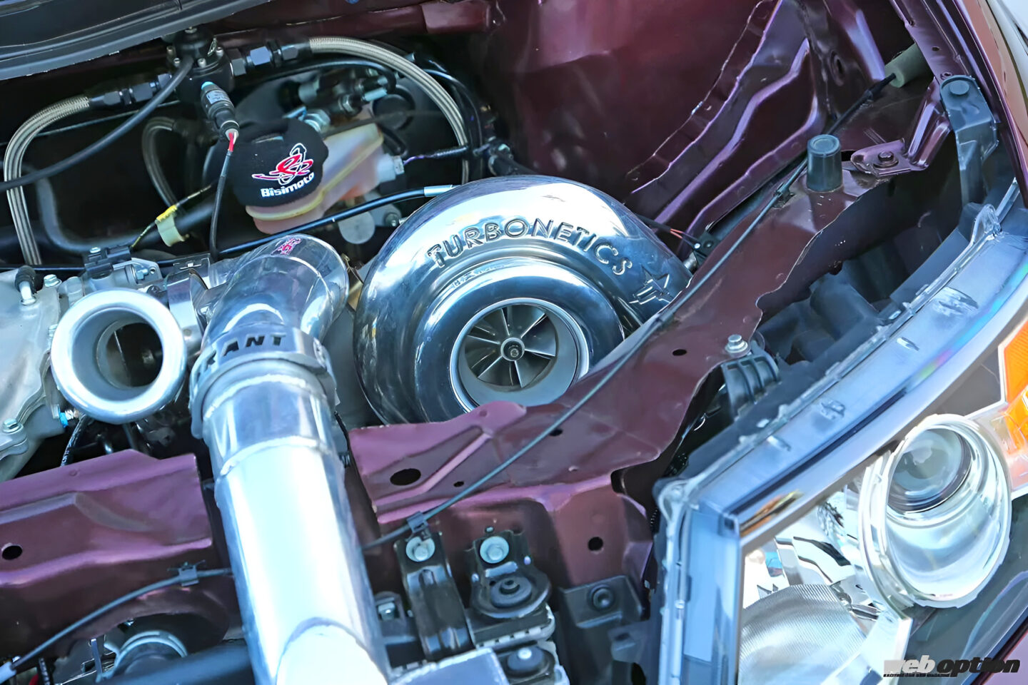 そんな強心臓に、オリジナルのEXマニを介してターボネティクスのBTX7265タービン&RG45ウエストゲートをセットアップ。メカニカル感の演出も徹底し、SPARCOのインタークーラーはグリルを突き破るようにレイアウトしている。最大ブースト圧は2.83キロの設定だ。