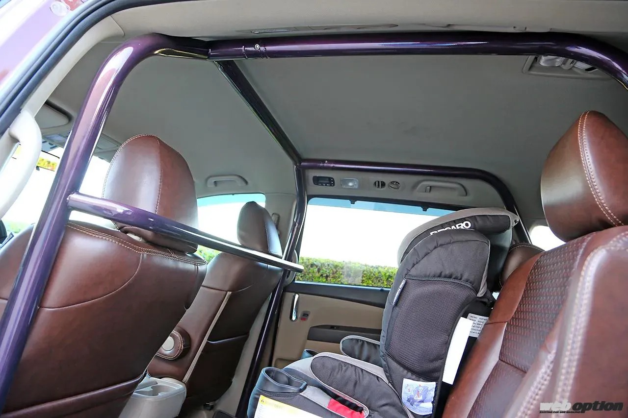 リヤドアを開けると、カスタムロールケージと娘さん専用のチャイルドシートが…。非常にシュールな絵である。ちなみにシートは全て高級レザーで貼り替え済みだ。