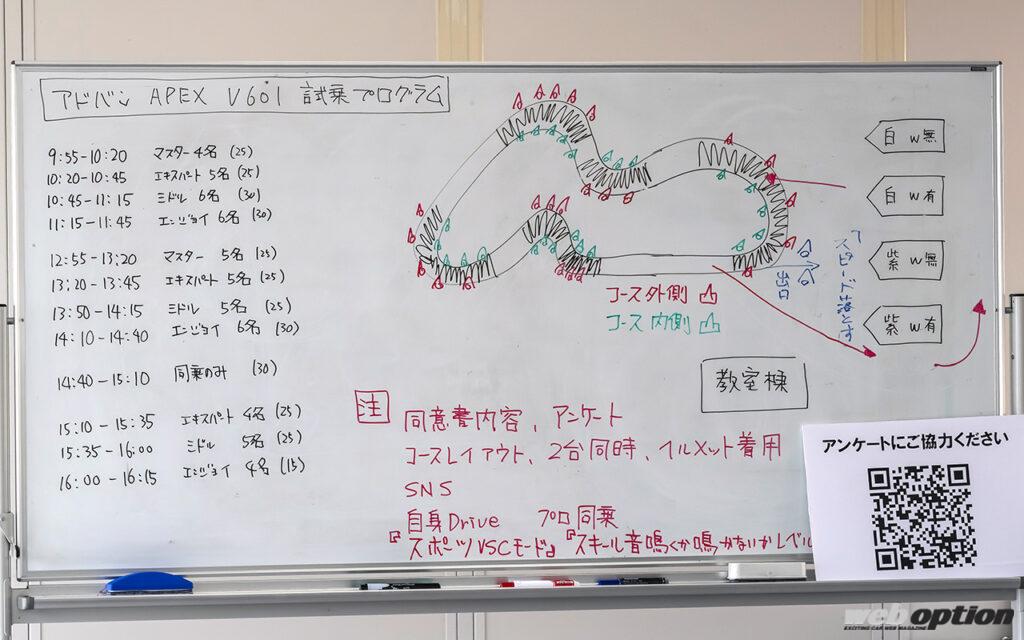 またコース外の特設会場では、アドバンの新タイヤ「APEX V601」の試乗会も開催。GRカローラRZの標準装着としても採用されたV601は、名作タイプDを彷彿させる左右非対称パターンとスポーツ性と快適性の好バランスが魅力。