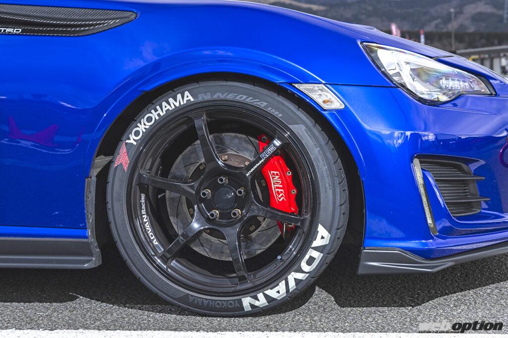 マシンはトラストのボルトオンターボにZN8用6MTという仕様。ホイール&タイヤは、もちろんアドバンレーシングRGIII(F8J×18、R9.5J×18)にアドバンネオバAD09(F225/40R18 R255/35R18)で決まり。レーシーなタイヤレターは、ショップに依頼して追加したというから恐れ入る。