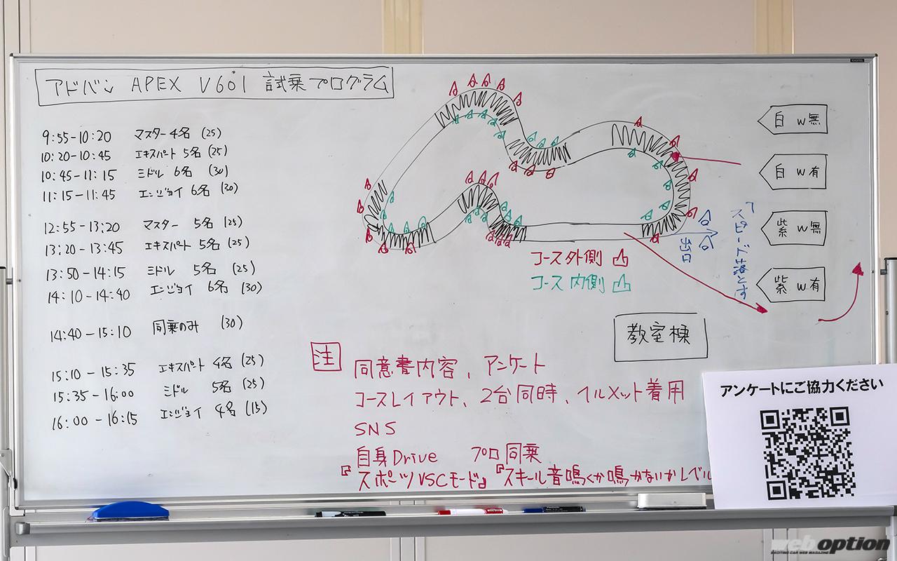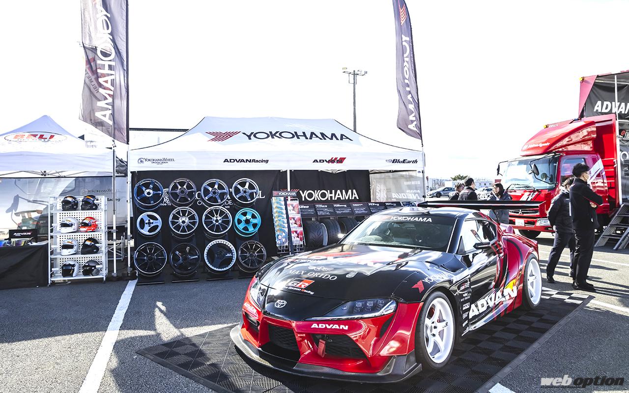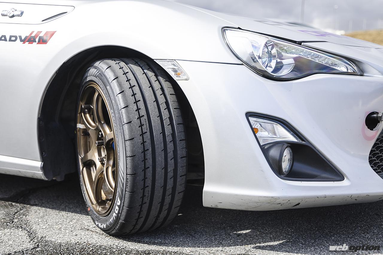 またコース外の特設会場では、アドバンの新タイヤ「APEX V601」の試乗会も開催。GRカローラRZの標準装着としても採用されたV601は、名作タイプDを彷彿させる左右非対称パターンとスポーツ性と快適性の好バランスが魅力。