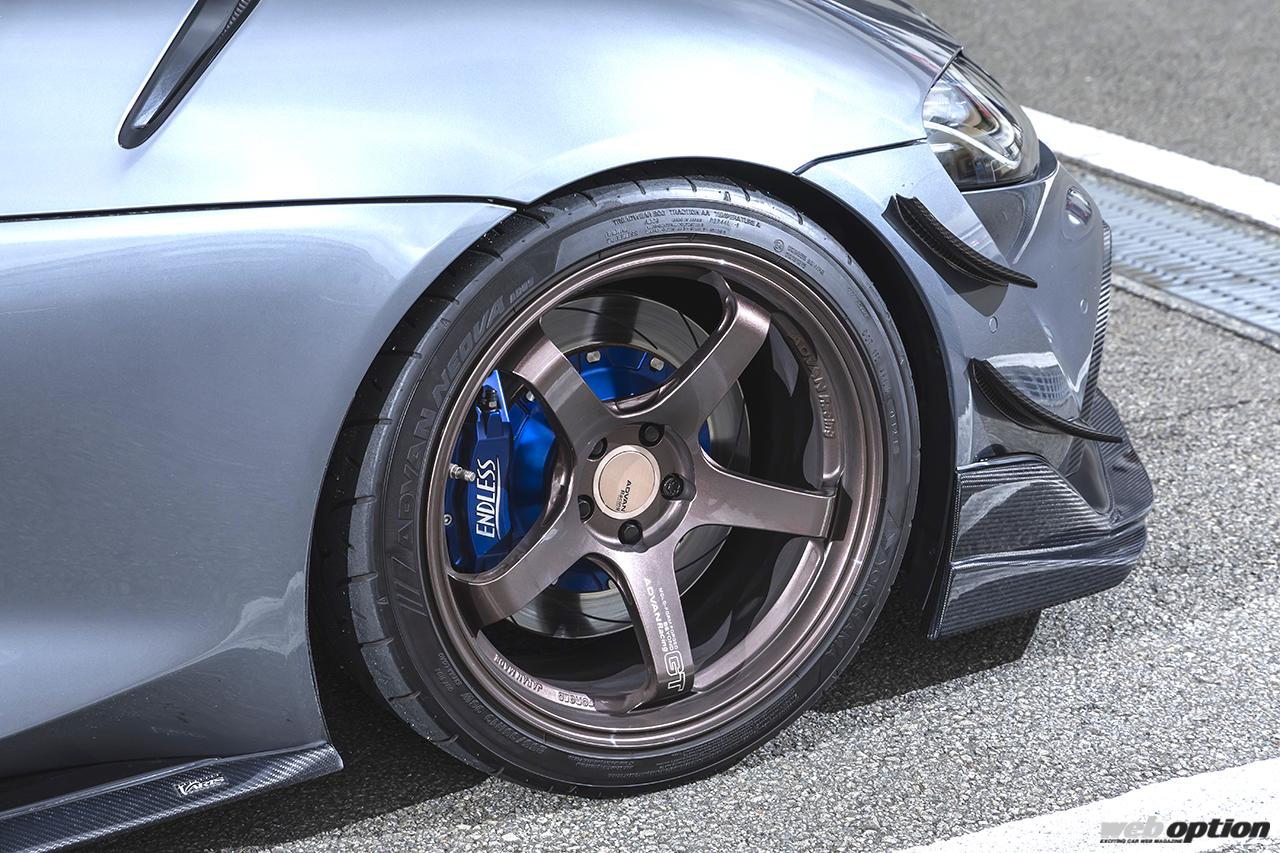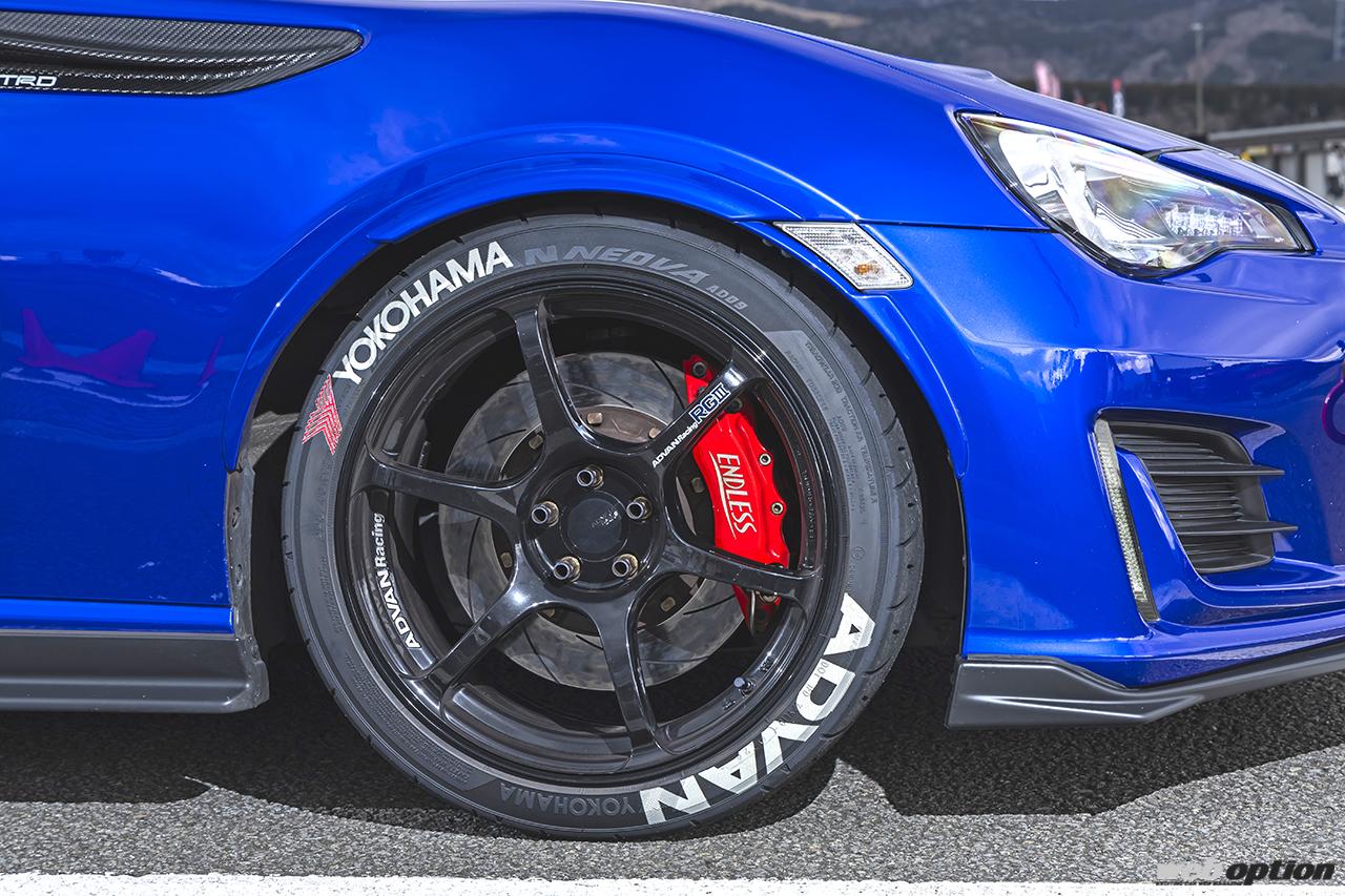 マシンはトラストのボルトオンターボにZN8用6MTという仕様。ホイール&タイヤは、もちろんアドバンレーシングRGIII(F8J×18、R9.5J×18)にアドバンネオバAD09(F225/40R18 R255/35R18)で決まり。レーシーなタイヤレターは、ショップに依頼して追加したというから恐れ入る。