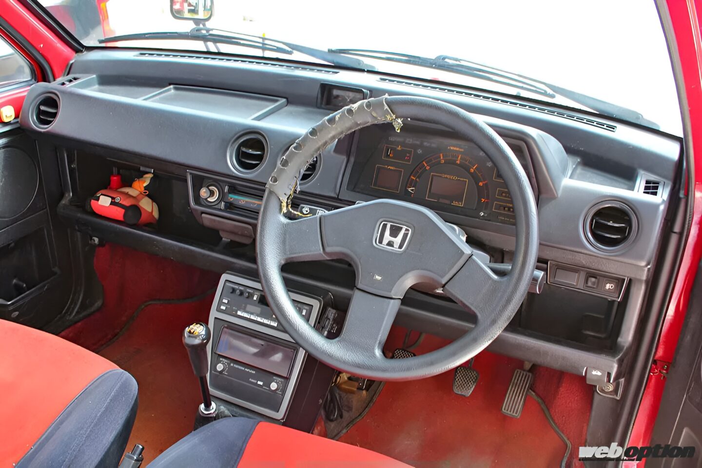 外装ではボンネット上のパワーバルジとTURBOのロゴ入りフロントグリル、前後バンパーとサイドモールをグルッと囲うように入れられた赤いラインがターボの証。それと長いステーのフェンダーミラーも、「やっぱり初代シティはコレだよね」と思うポイントだ。