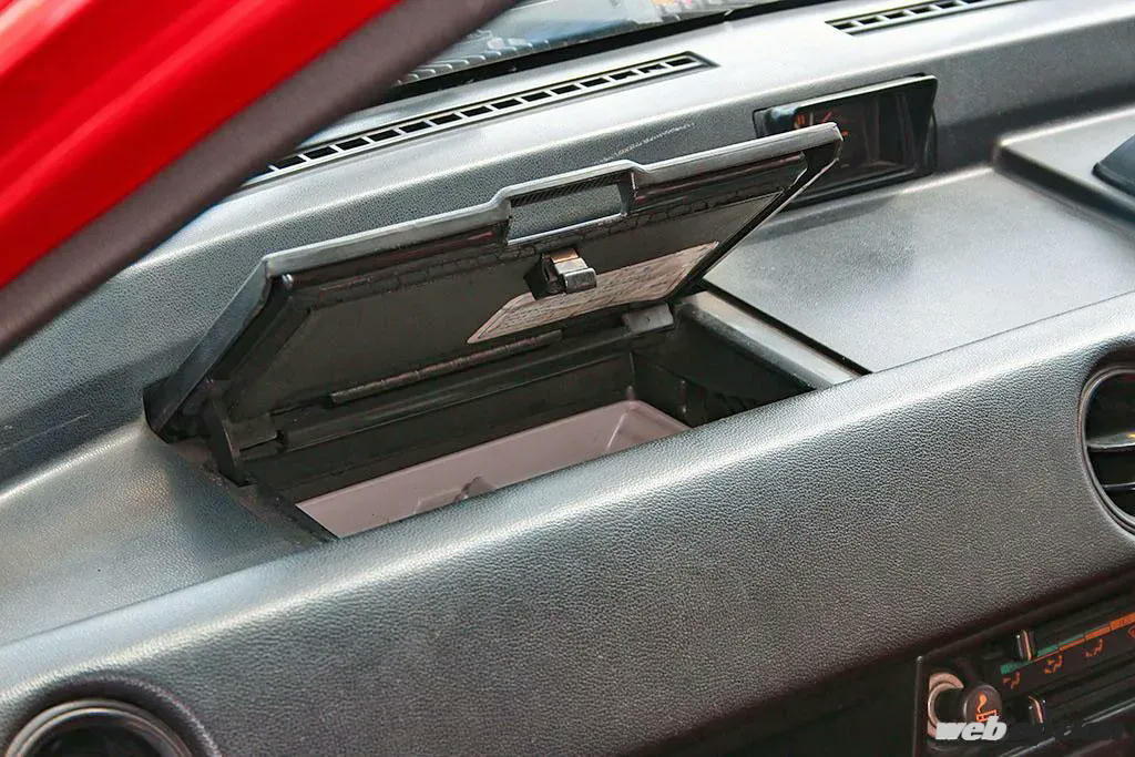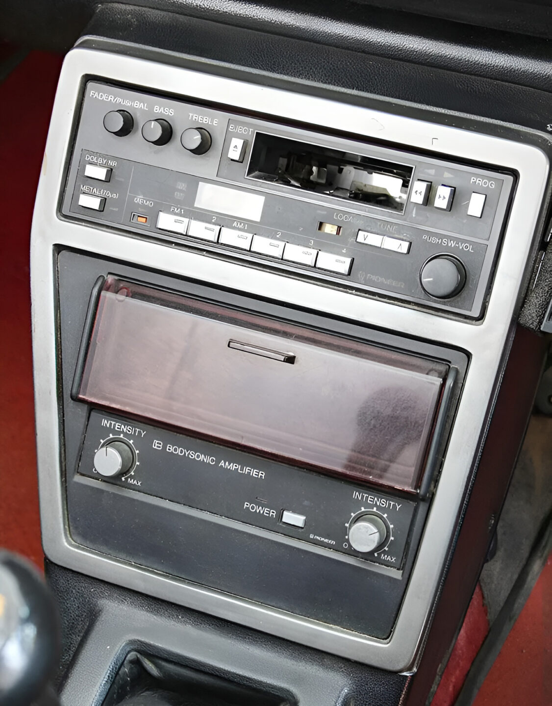 純正のパイオニア製AM/FM電子チューナー付きカセットデッキが残ってることに驚く。フタ付き小物入れの下がシートに内蔵されたボディソニック用のアンプで、運転席、助手席ともにボリュームダイヤルで効き具合を調整できる。