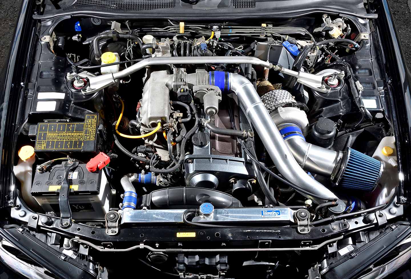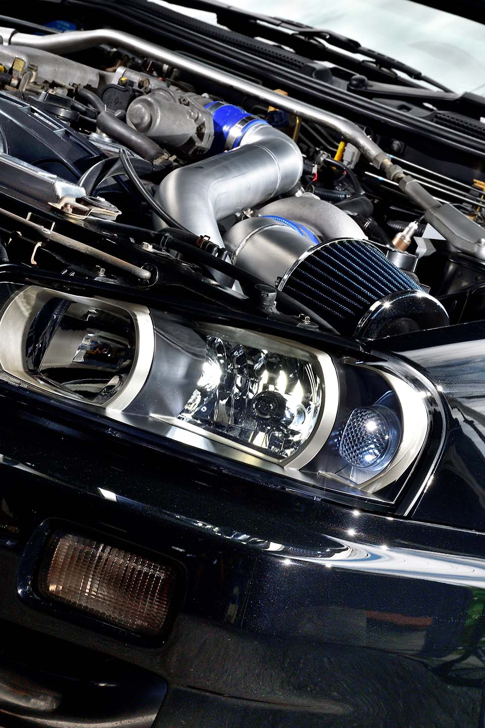 外装はシャフトオートサービスのタイプⅢエアロ(前後・サイド)に、純正風のハイマウントウイングをセット。ボンネット先端はGT-R風にアレンジされ、純正形状を踏襲したオリジナルヘッドライトも人気アイテムのひとつ。前後フェンダーはユーラス製で、片側約2cmワイド化されている。