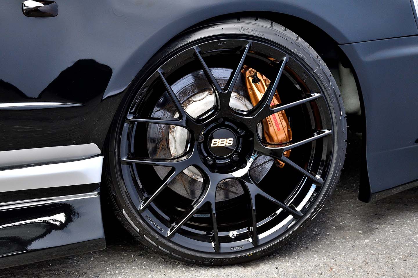 ホイールは“漆黒でまとめたい”というリクエストに応じ、BBS RE-V7(19×10J)を装着。タイヤはわずかに引っ張り気味の255/30R19(NITTO NT555 G2)を前後に履く。ブレーキはフロントがF50タイプ、リヤがGT-R用ブレンボという鉄板の組み合わせだ。