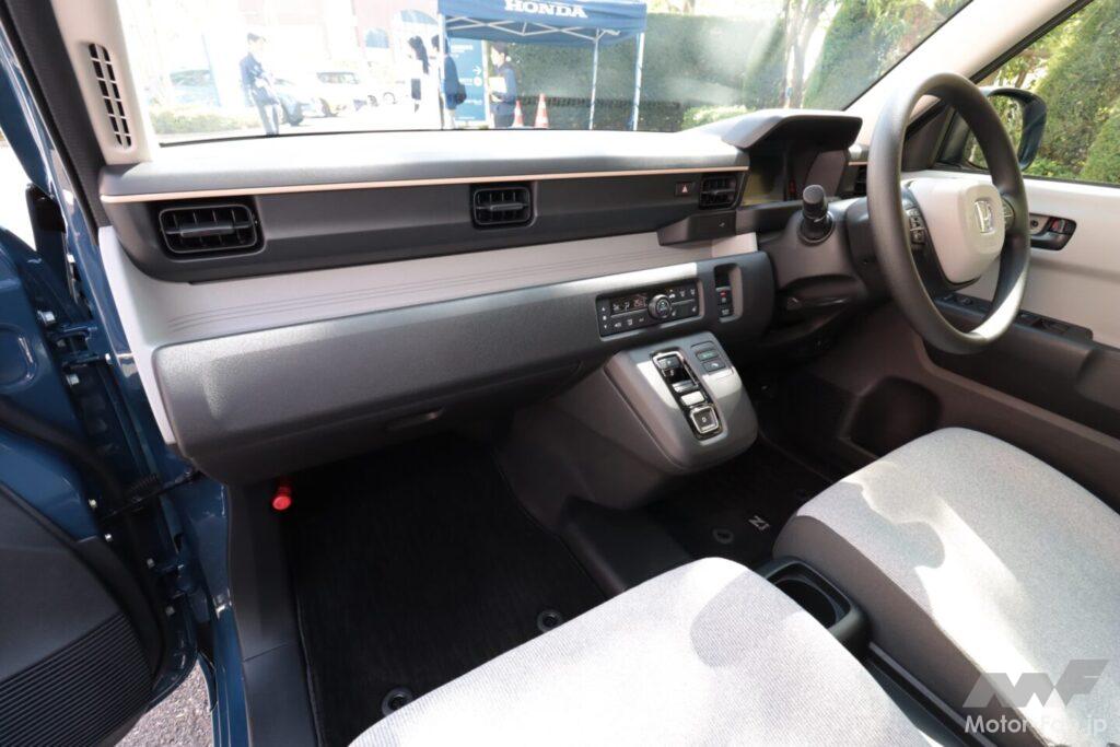 室内に目を移すと、その思いはさらに強まる。インパネシフトを採用したT字型のインパネ形状という点では共通だが、造形は全くの別物。加飾パネルの面積が広く、随所にレトロテイストが感じられるガソリン車に対し、N-ONE e:はデザイン要素を減らし水平基調を強調したシンプルかつモダンなものへ一新。メーターが異形2眼コンビから、フィットなどと同様の7インチTFT液晶になったのも、そうした印象を与えるのに一役買っている。